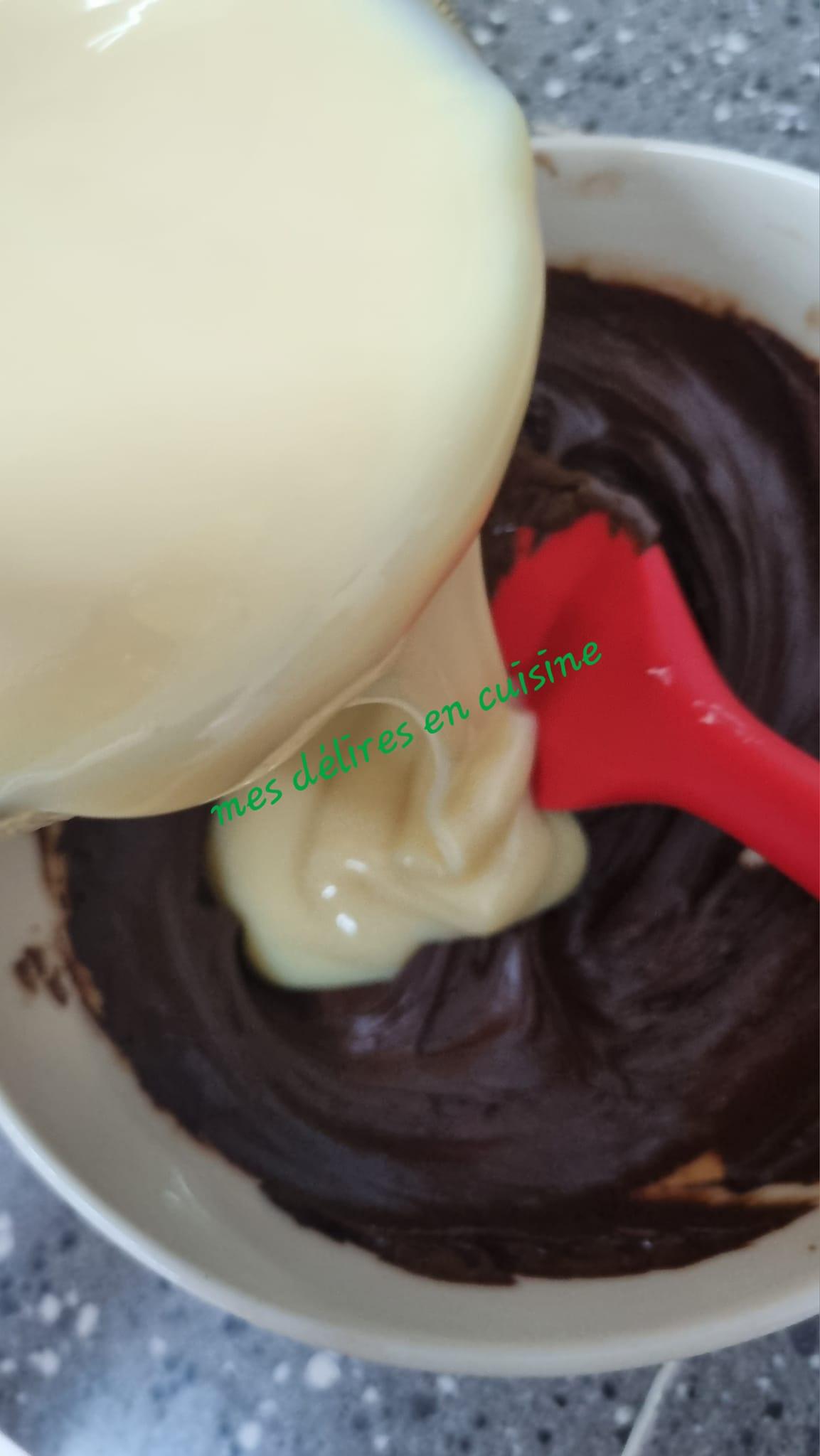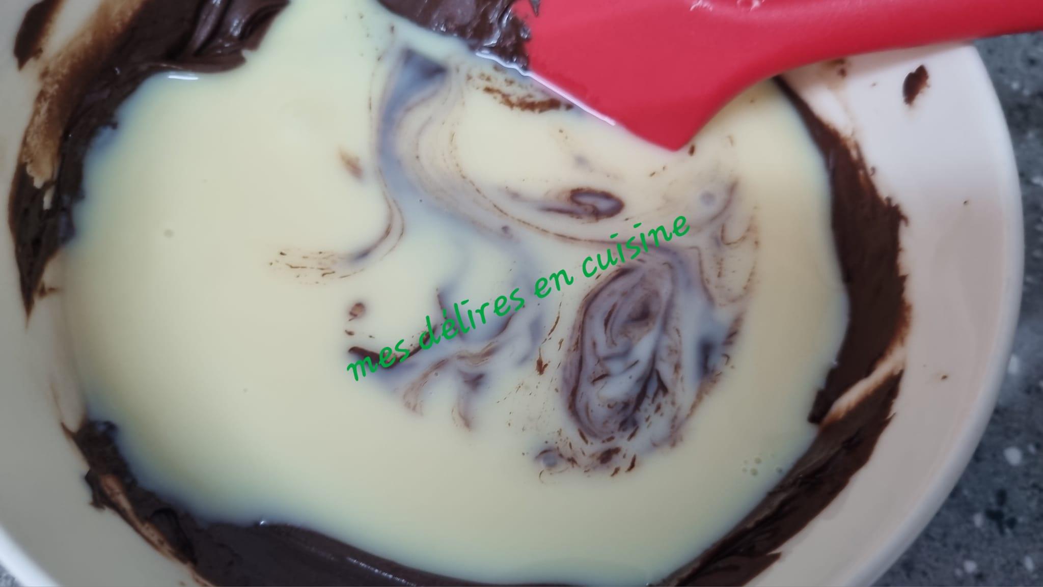 - Incorporez le lait concentré sucré au chocolat fondu et mélangez bien.
