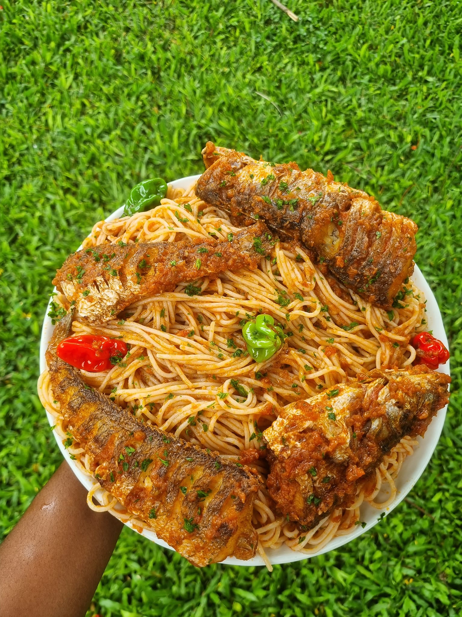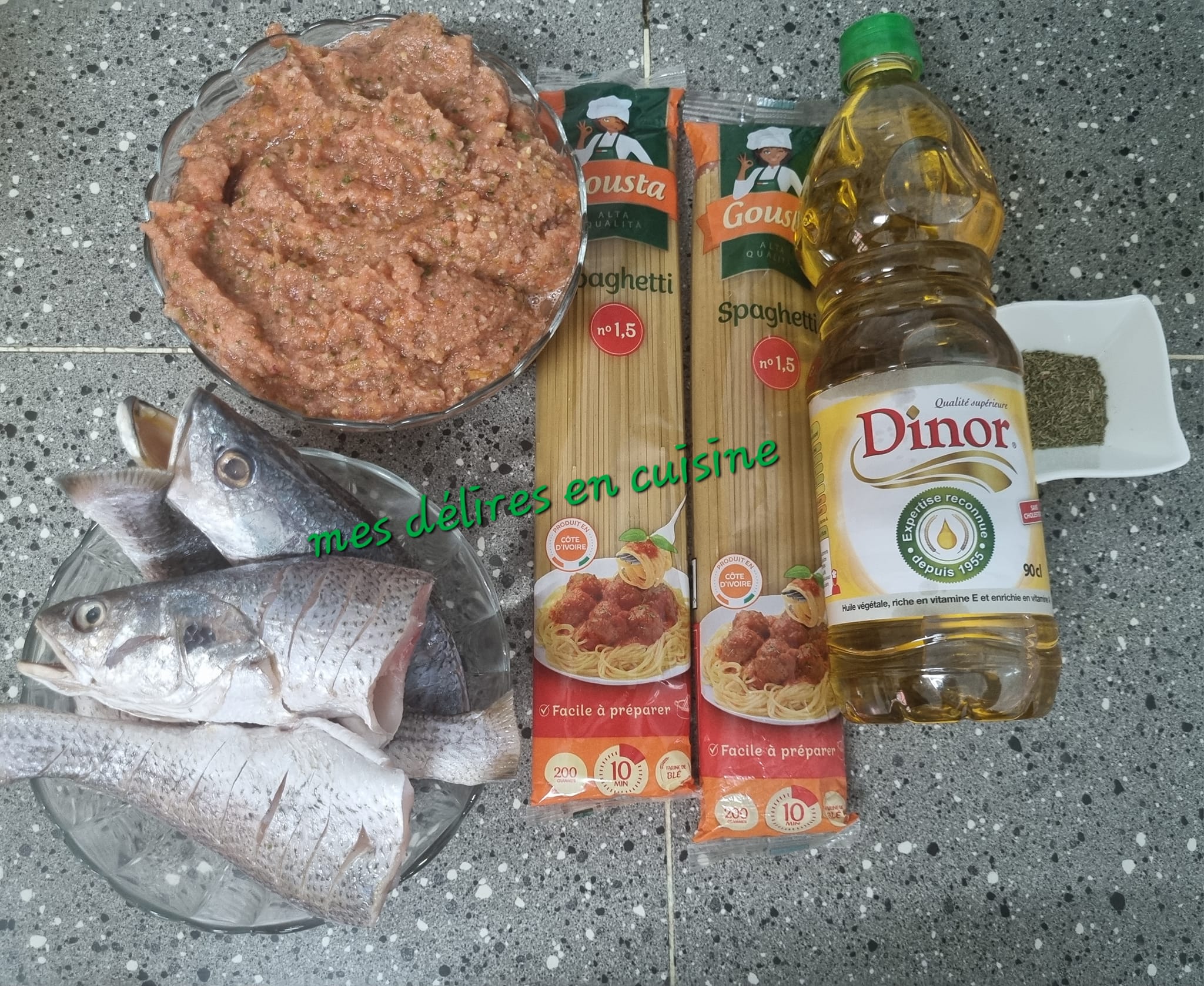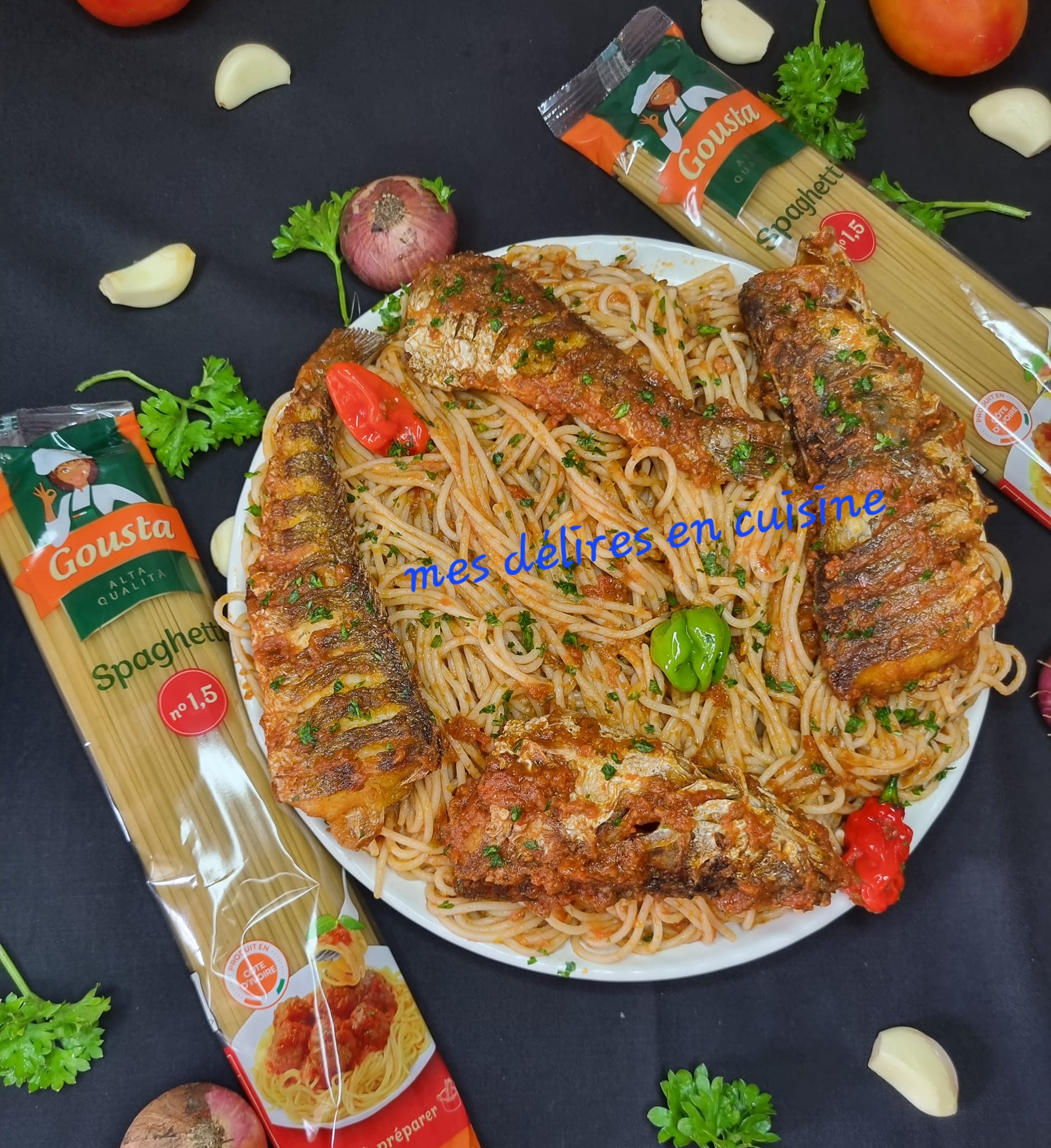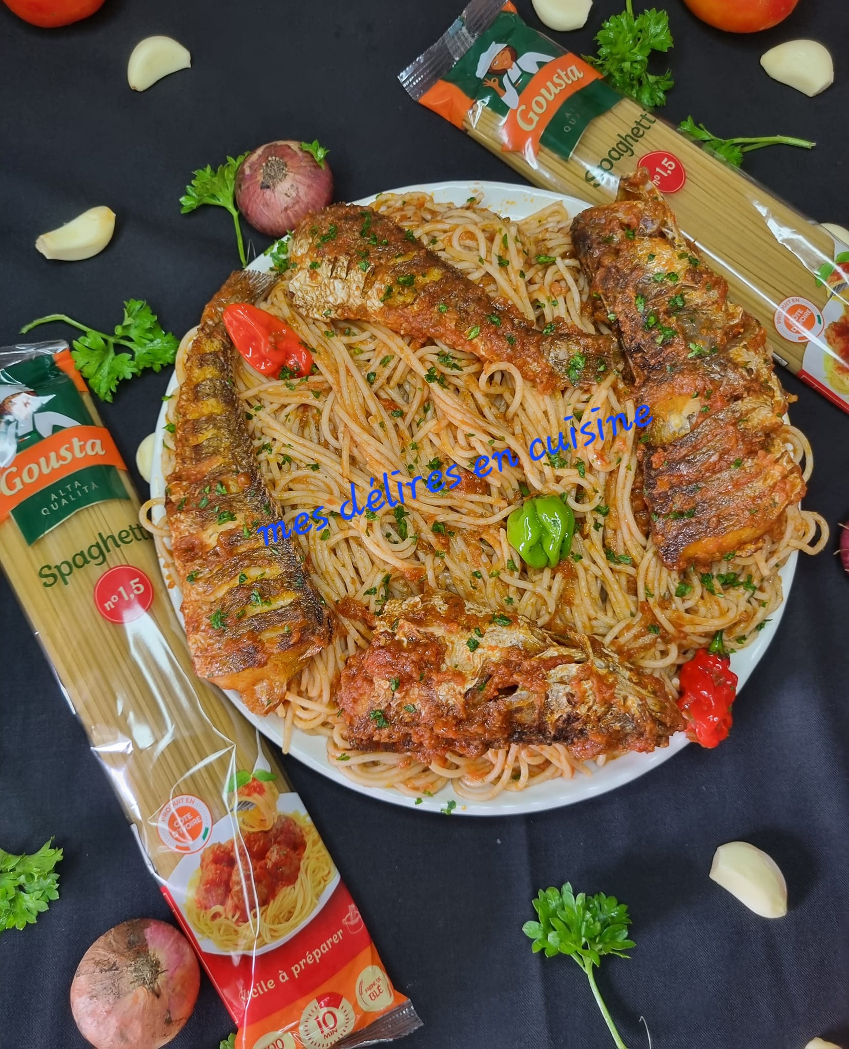 Découvrez ce délicieux sauté de spaghettis au poisson frit, une fusion savoureuse de pâtes et de poisson croustillant, relevée par une sauce tomate parfumée.