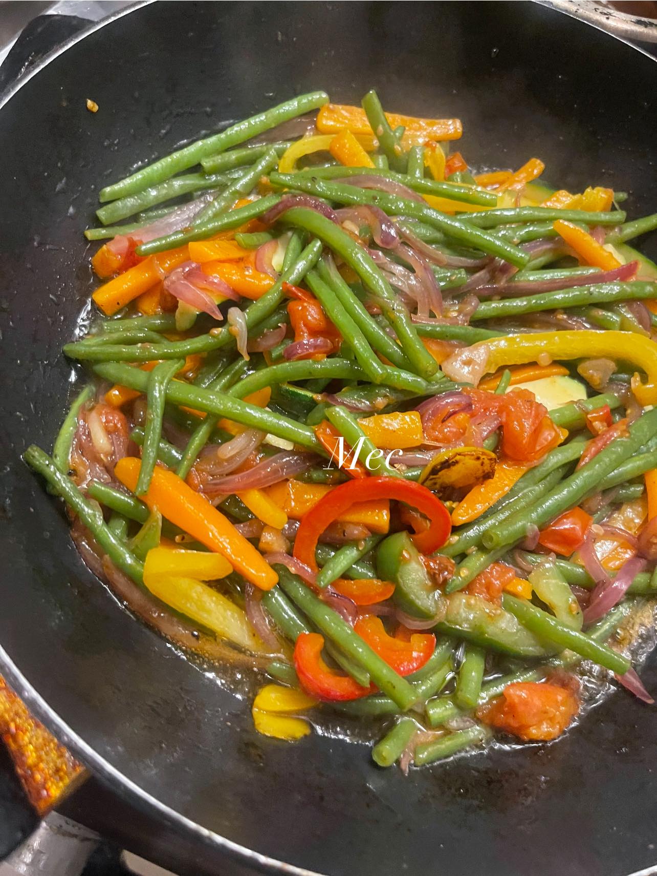 - Incorporez les poivrons, les courgettes et les haricots verts précuits. Faites sauter le tout pendant quelques minutes jusqu’à ce que les légumes soient tendres mais encore croquants.