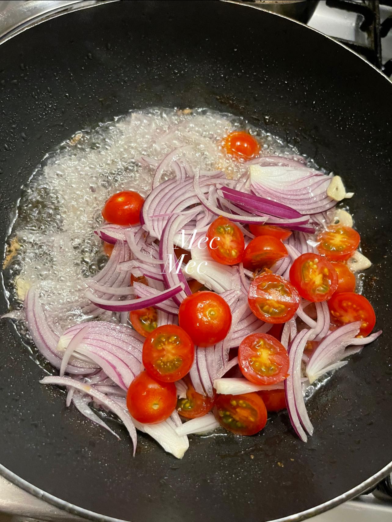 - Dans la même poêle, ajoutez un peu d’huile si nécessaire et faites revenir l’ail et l’oignon jusqu’à ce qu’ils soient translucides.