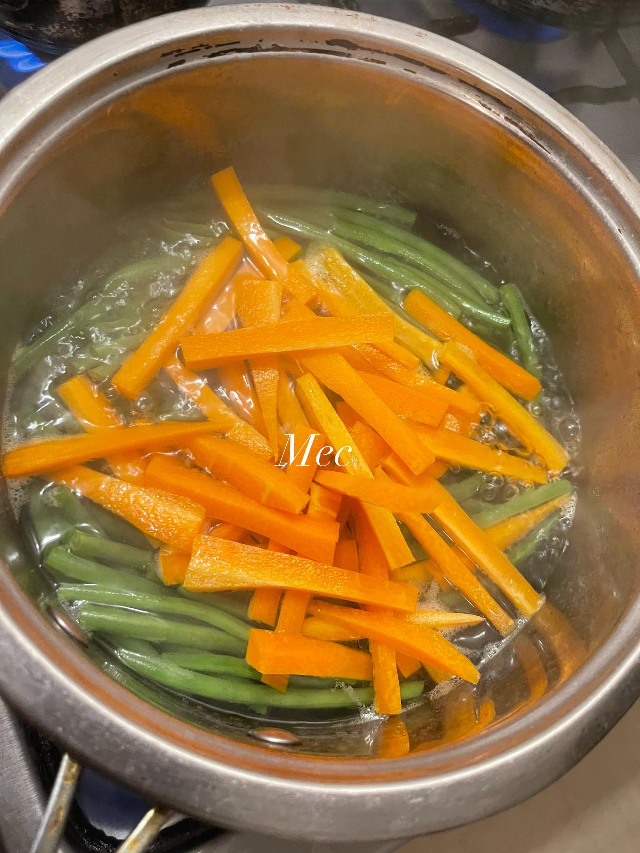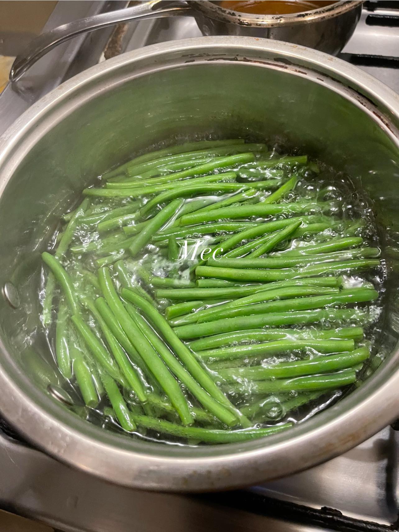 - Équeutez les haricots verts et faites-les bouillir dans de l’eau salée pendant 5 minutes. Égouttez et réservez.