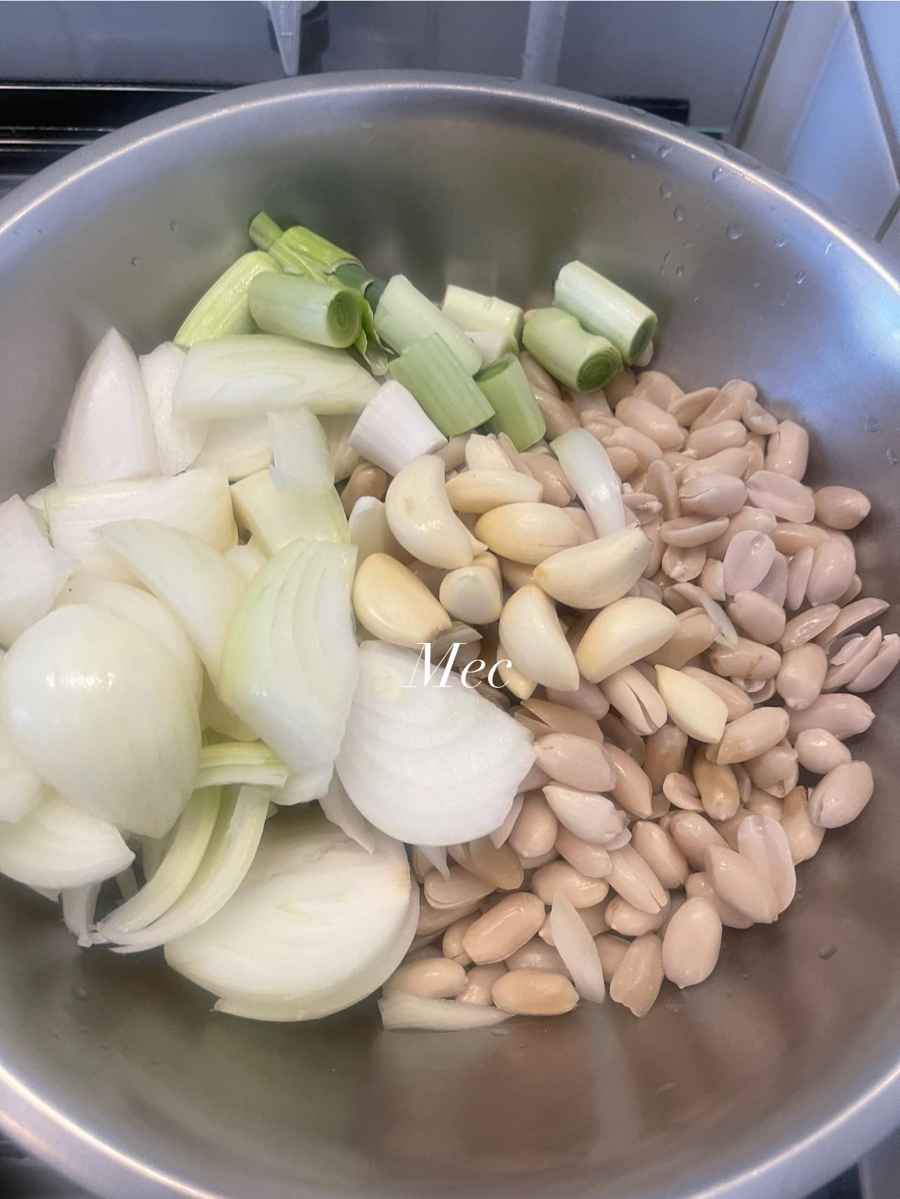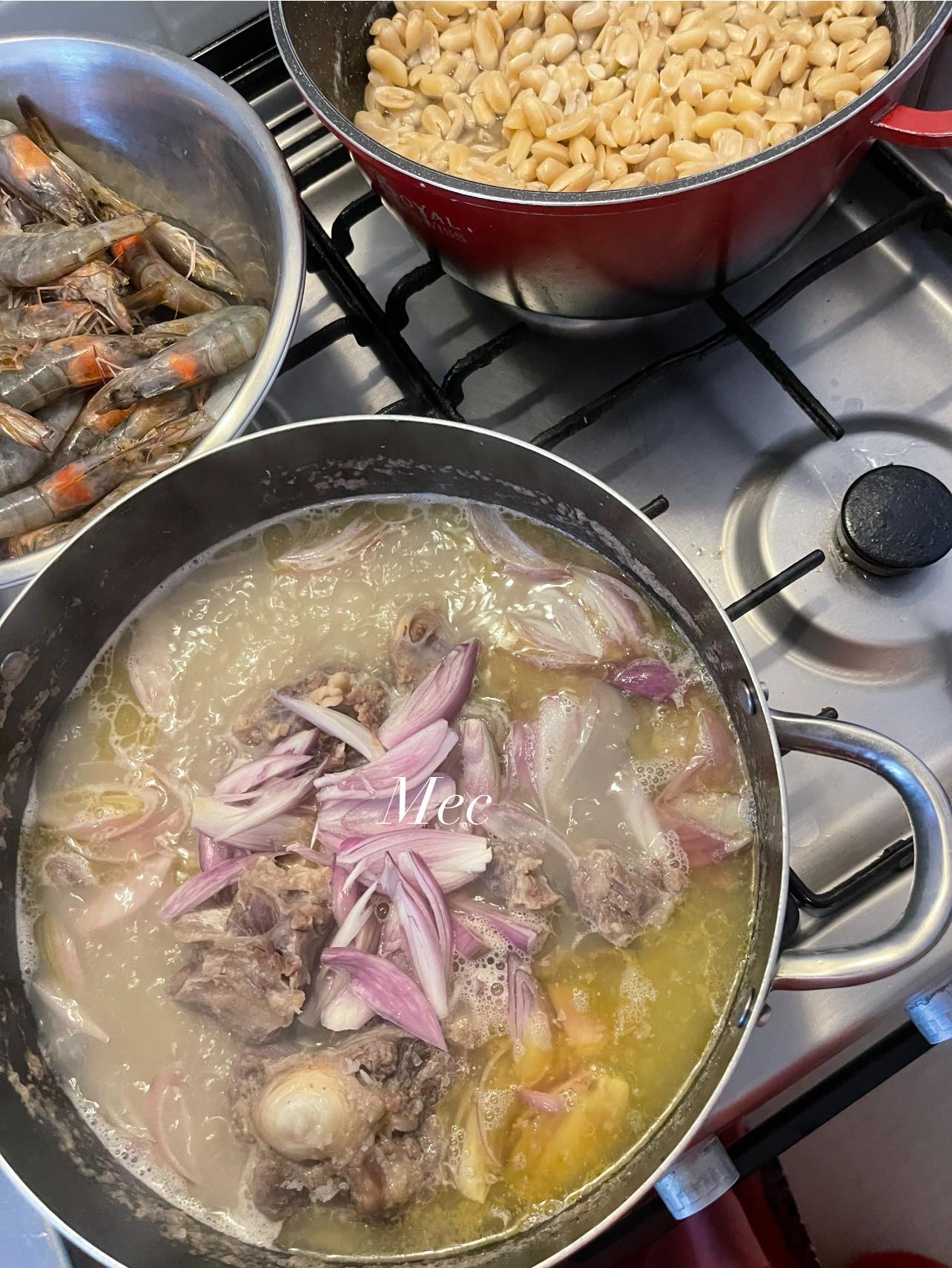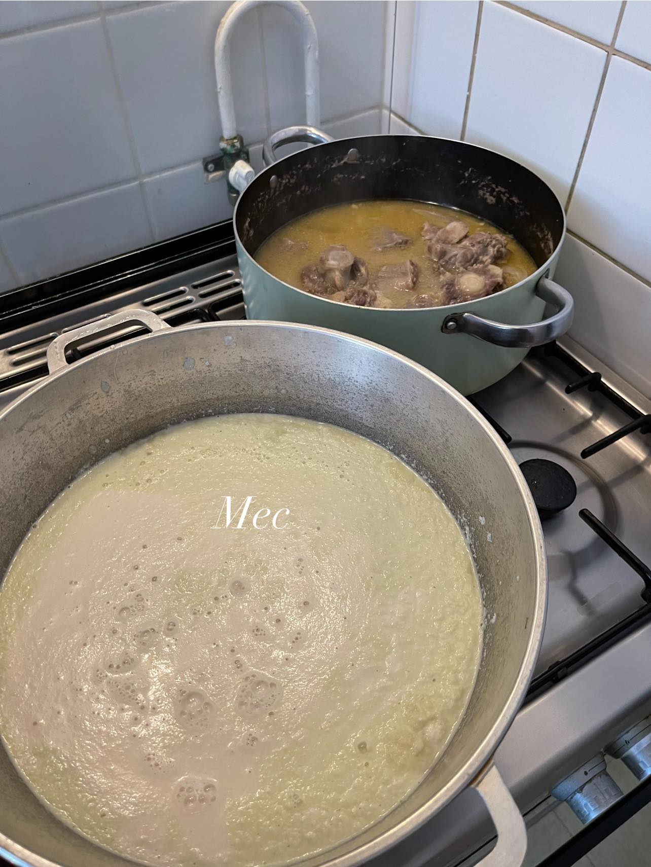 - Dans une marmite, faites cuire la viande avec un peu de sel jusqu’à ce qu’elle soit tendre. Réservez le bouillon.