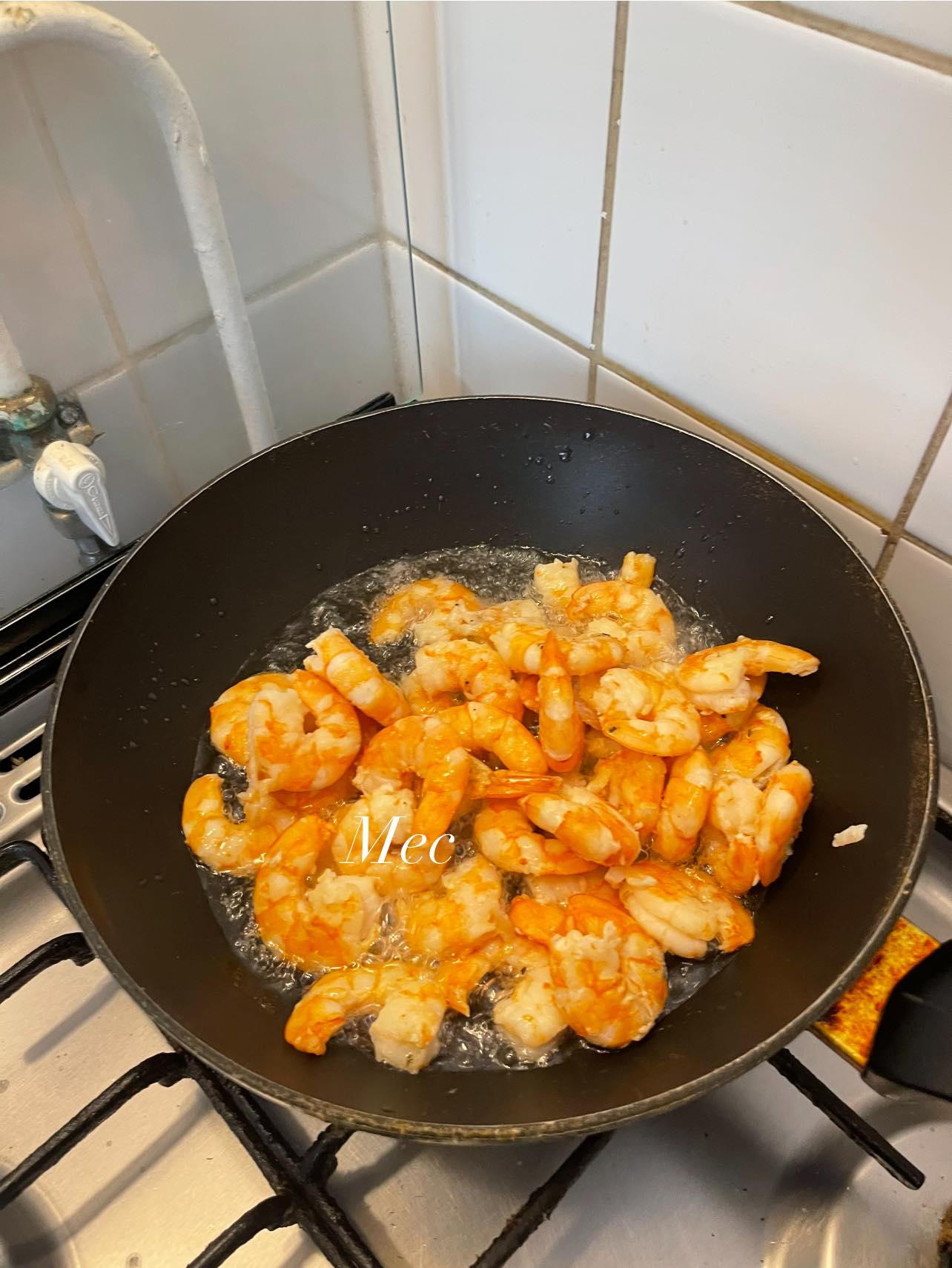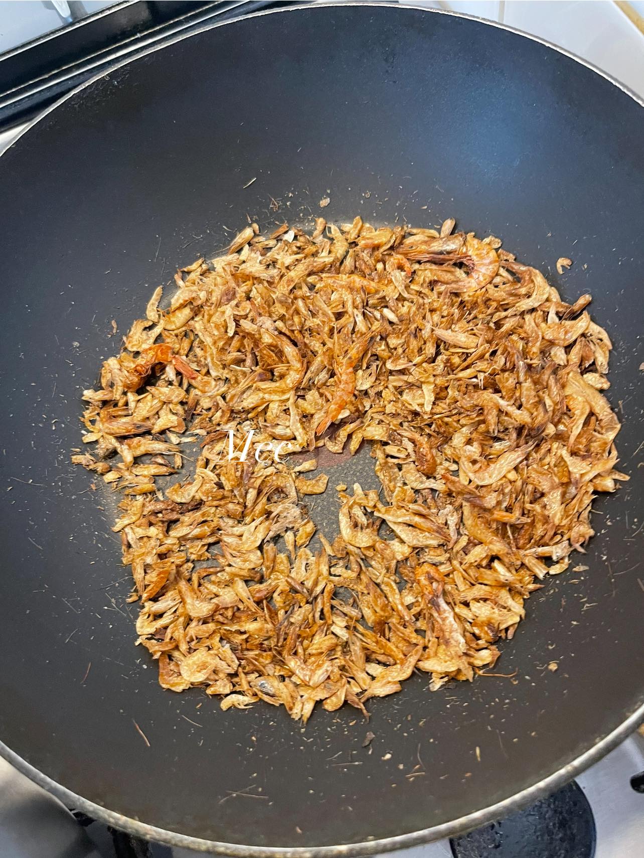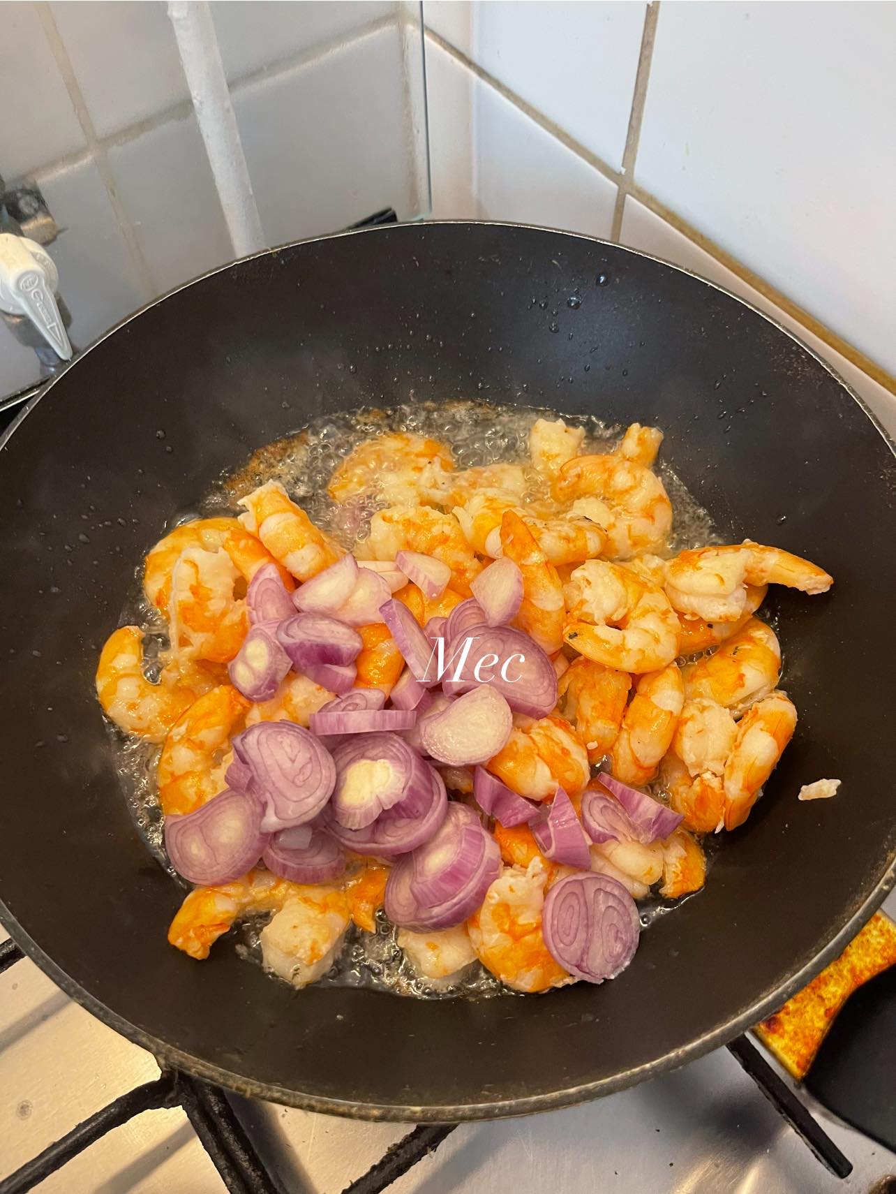 - Dans une poêle, faites chauffer un peu d’huile et faites sauter les crevettes fraîches avec le second oignon émincé et le piment. Assaisonnez selon votre goût.