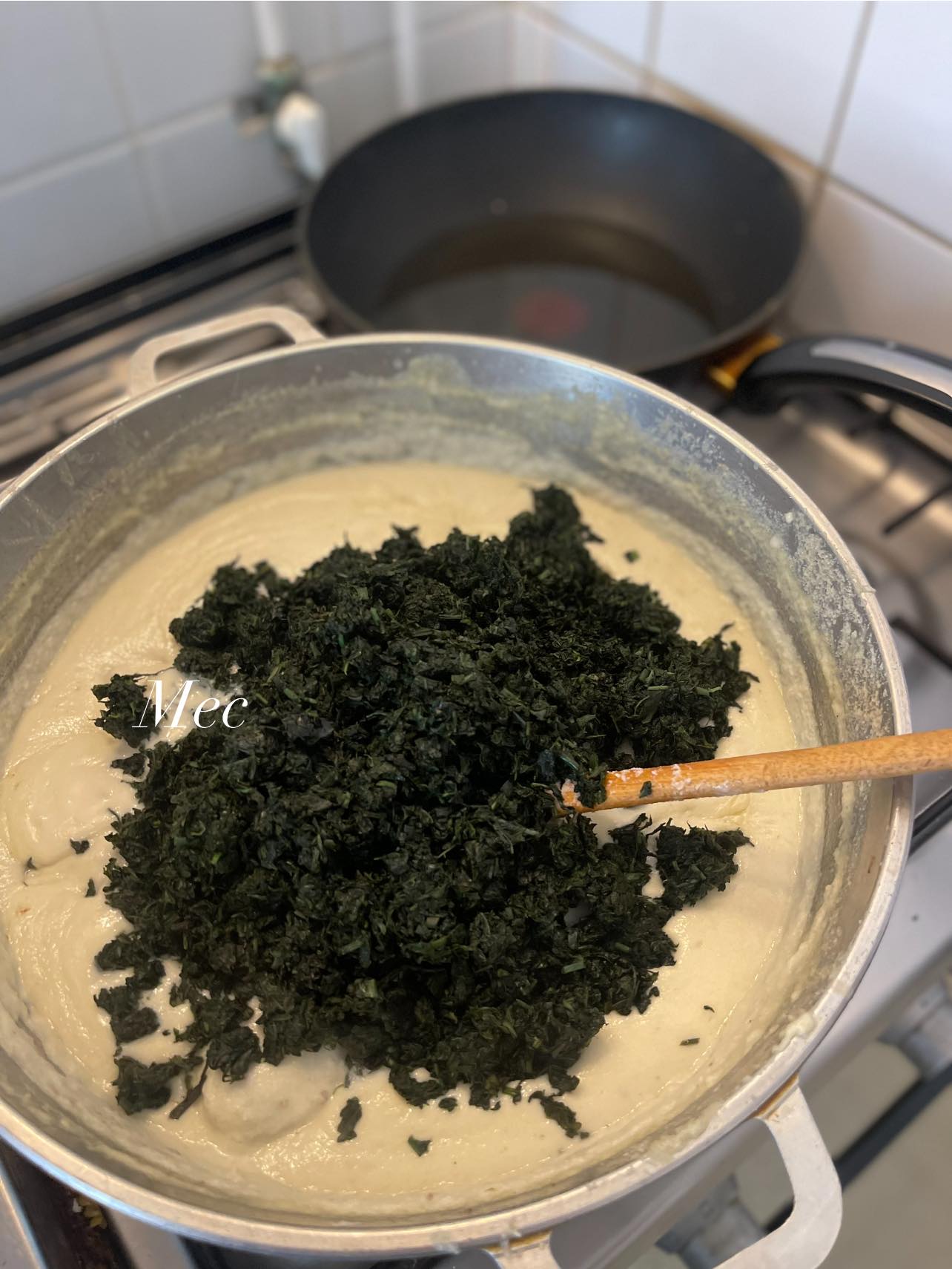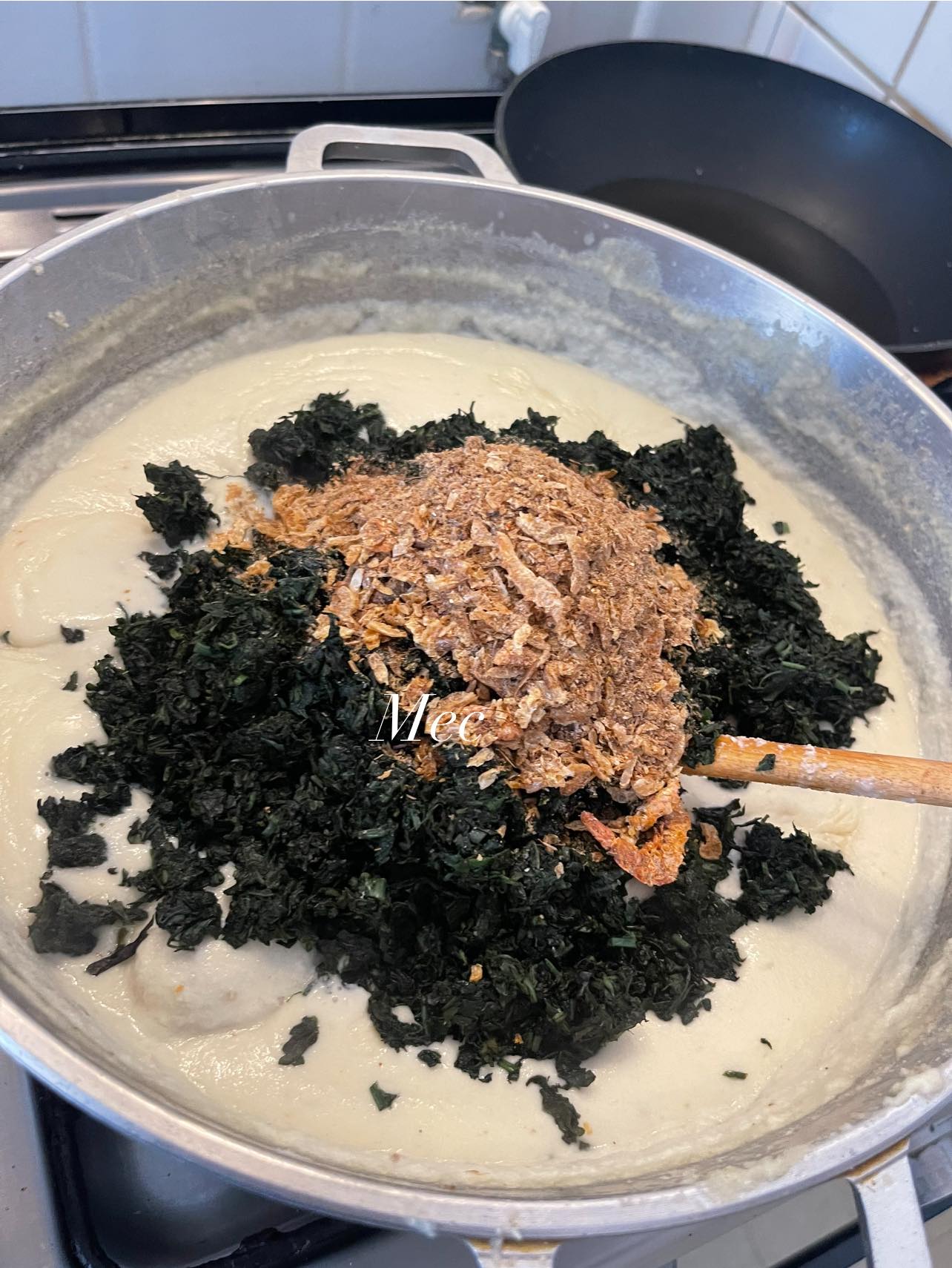5⃣ Ajout des crevettes séchées et des feuilles de ndolè :