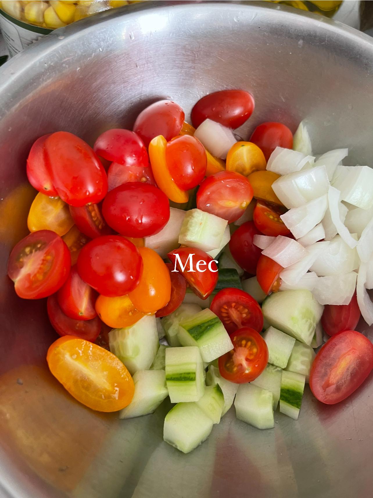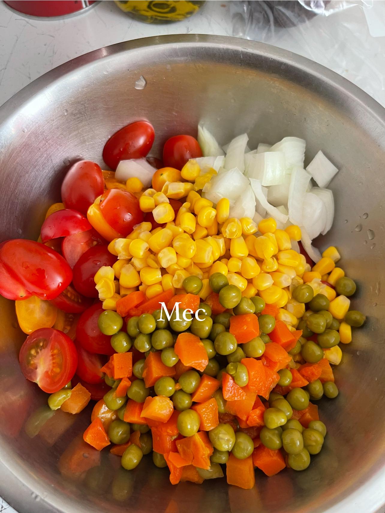 - Dans un grand saladier, mélangez les tomates, les oignons, les concombres, le maïs, les petits pois, les carottes râpées et le persil ciselé.