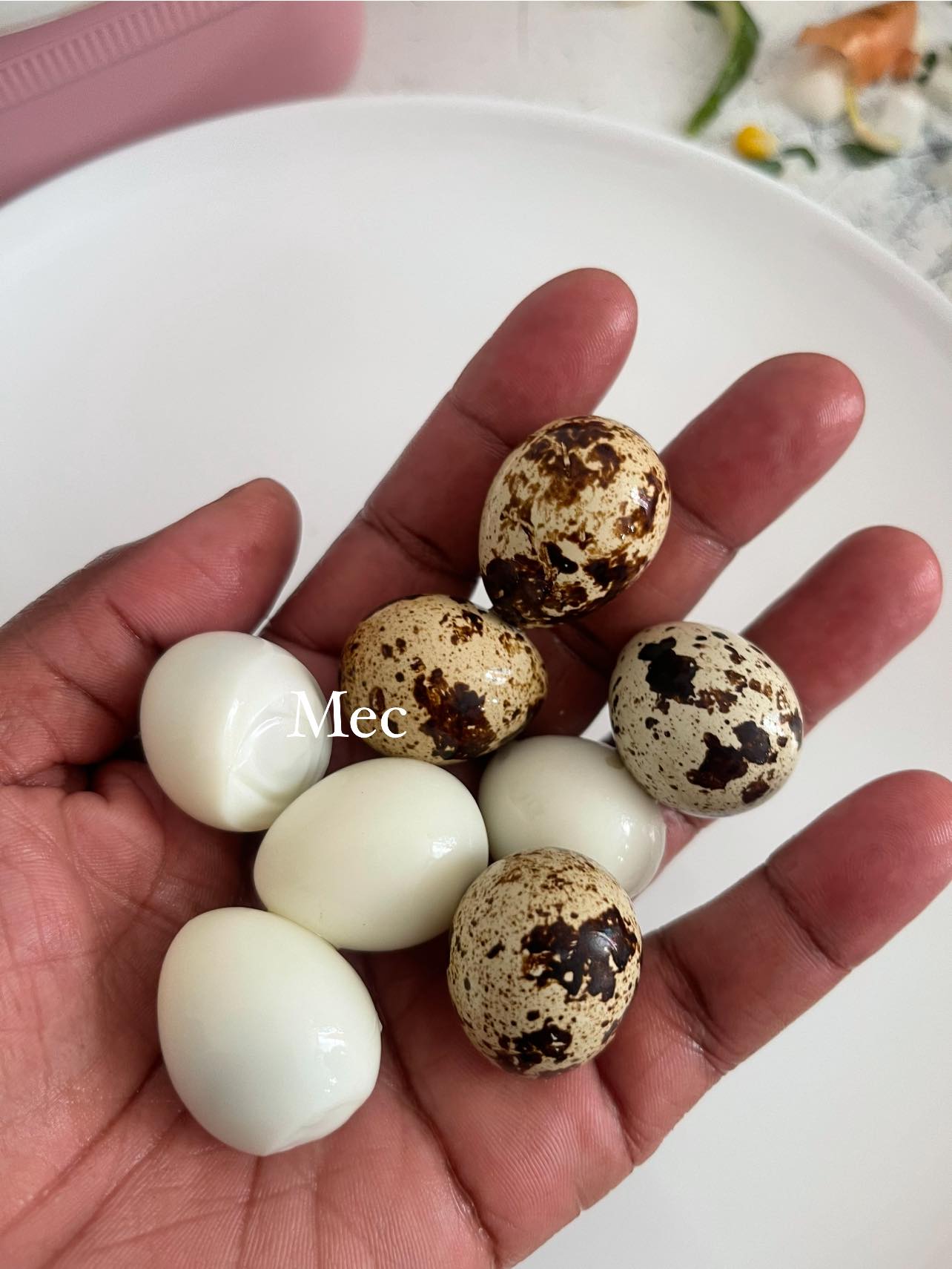 - Coupez les œufs de caille en deux et ajoutez-les délicatement au mélange.