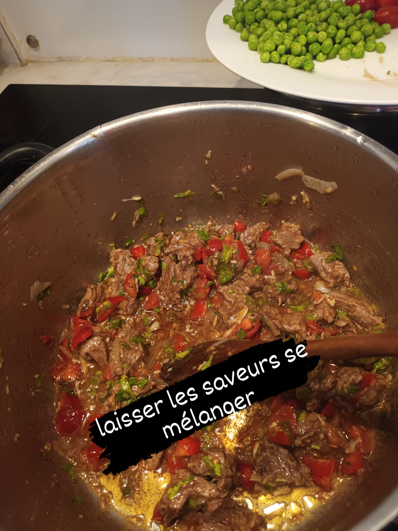 - Ajoutez les tomates hachées et les petits pois. Mélangez bien et laissez cuire jusqu’à ce que les tomates se décomposent légèrement.