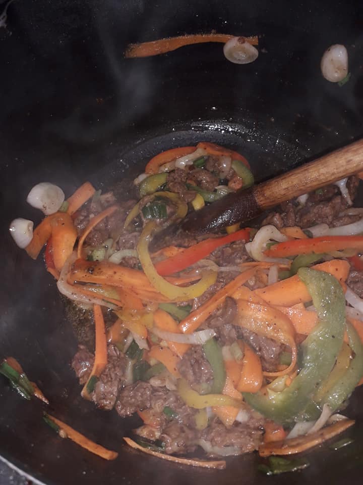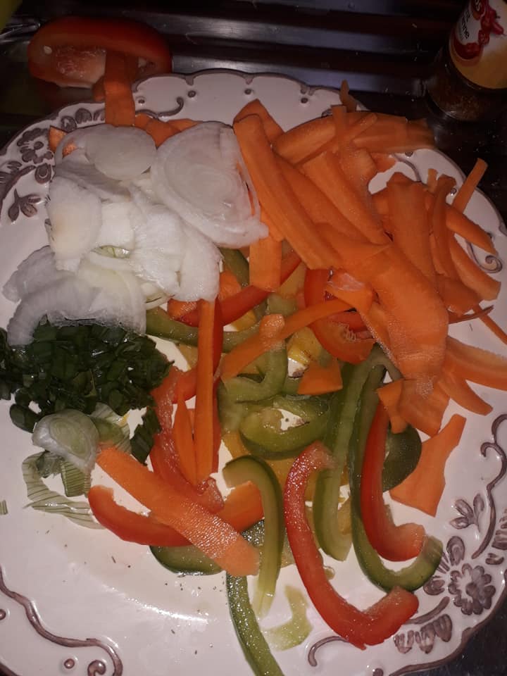 - Incorporez les poivrons, les carottes et l’oignon botte dans la poêle.