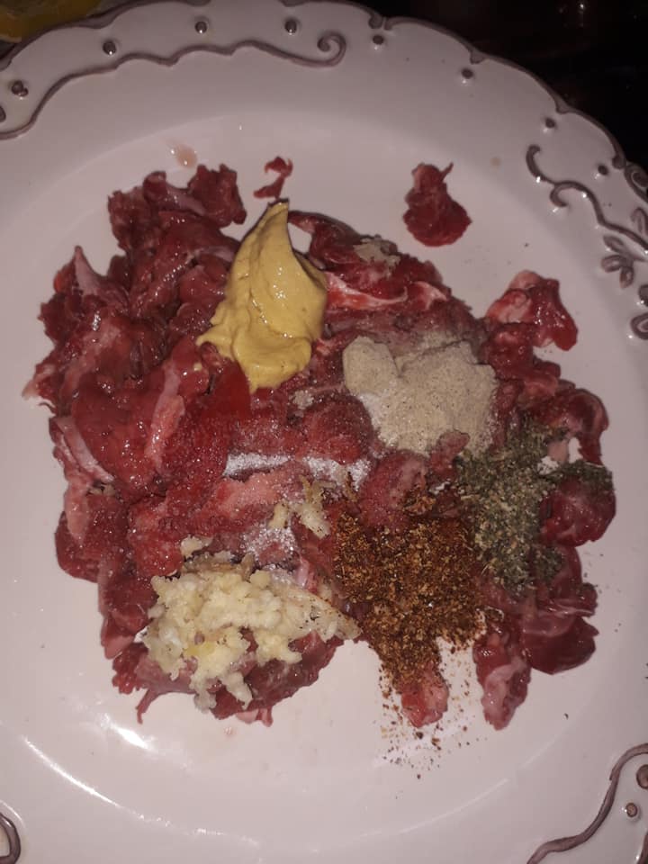 - Dans un bol, mélangez la viande avec l’ail, le persil, la moutarde, le sel et le poivre. Laissez mariner pendant 10 minutes pour imprégner les saveurs.