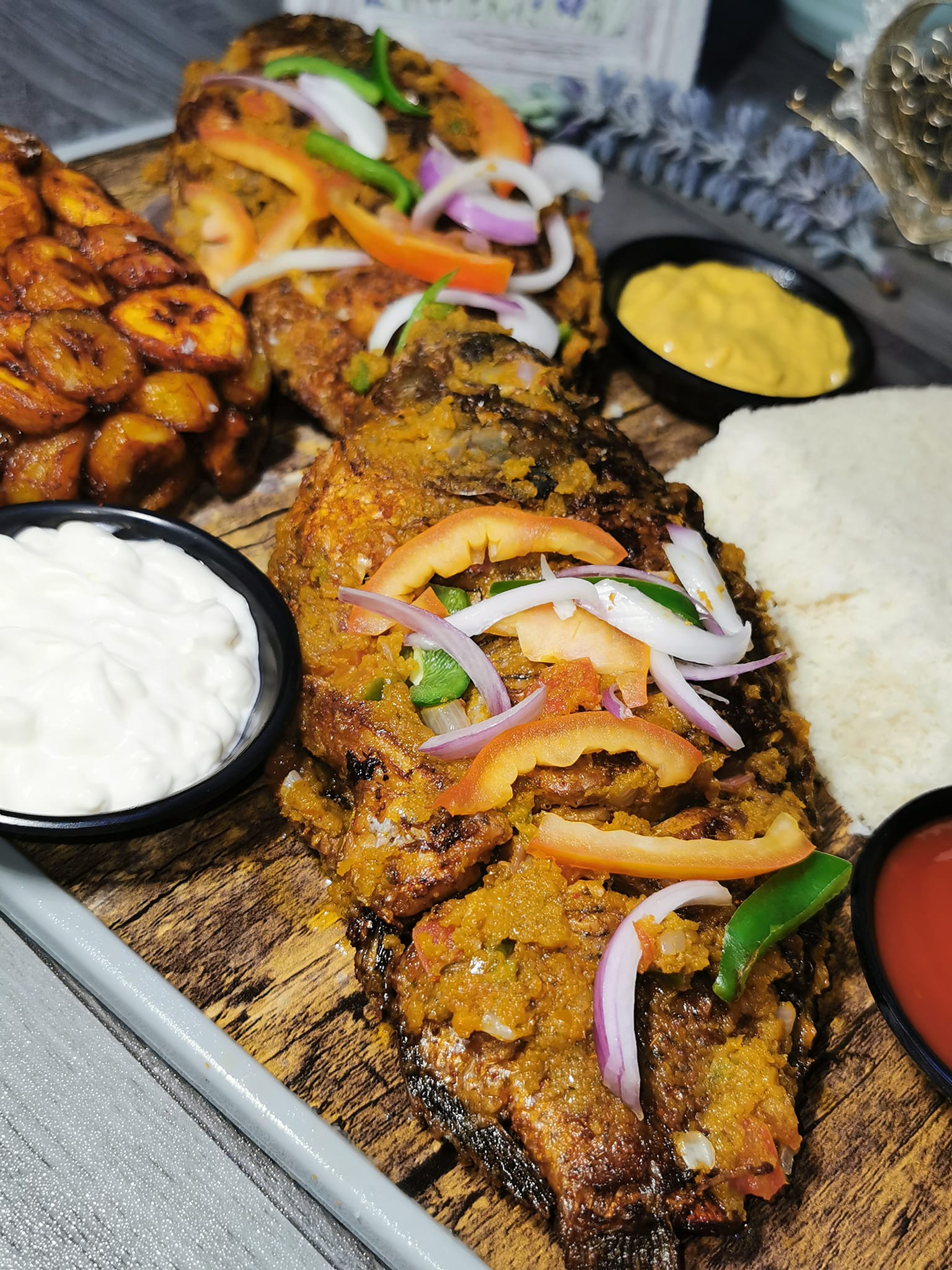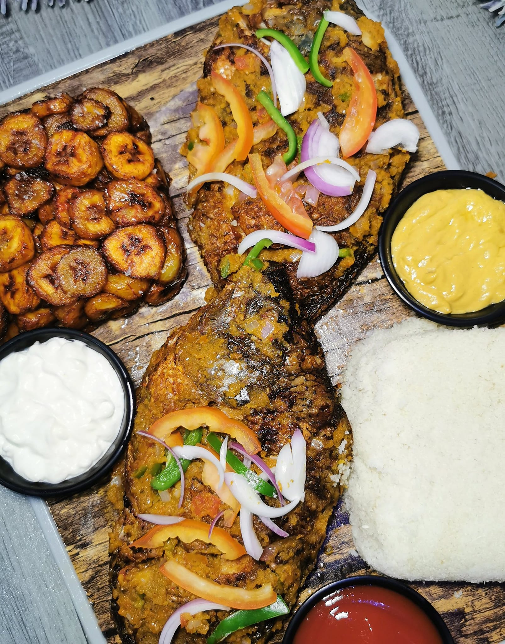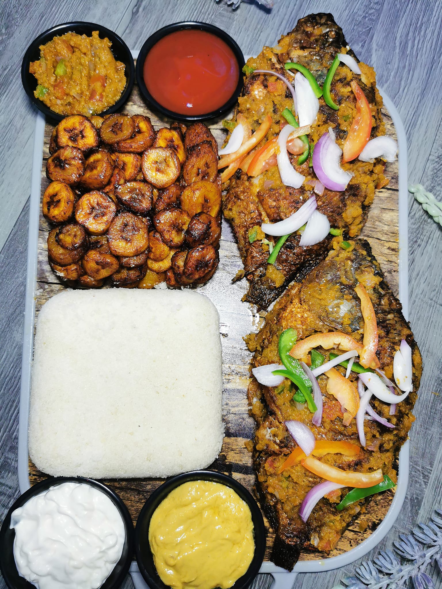 Savourez ce Poisson Frit en Sauce, Accompagné d’Attiéké et d’Alloco, un plat typique alliant la saveur du poisson frit, la douceur des bananes plantains frites et la légèreté de l’attiéké.
