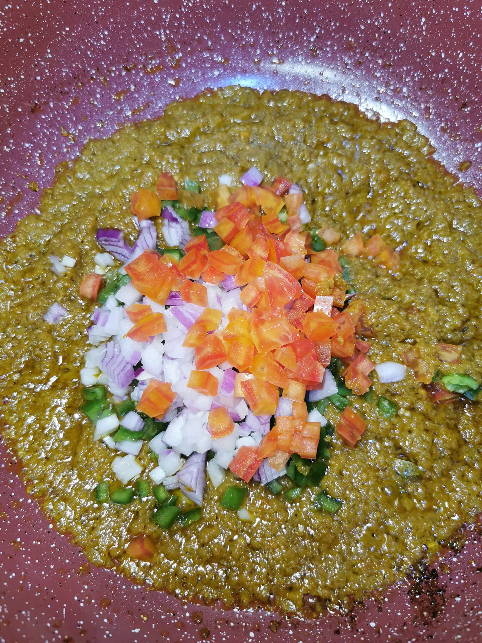 - Ajoutez ensuite des oignons, des poivrons et des tomates coupés en dés. Poursuivez la cuisson pendant 5 minutes supplémentaires.