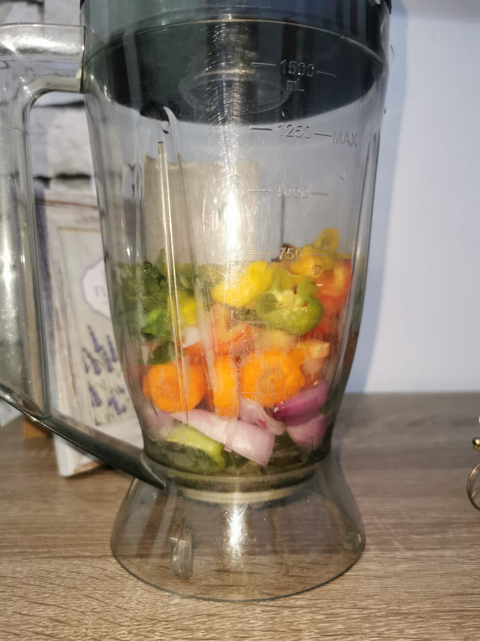 - Mixez ensemble les légumes suivants : piment, persil, oignons, tomates, carottes et poivrons, jusqu’à obtenir une purée homogène.