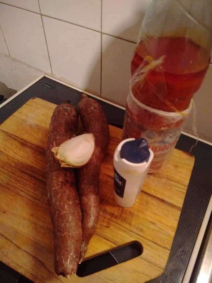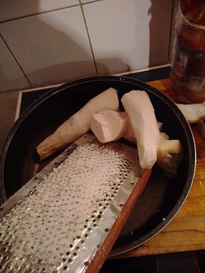 - Dans un bol, mélangez le manioc râpé avec du sel et l’oignon râpé jusqu’à obtention d’une pâte homogène.