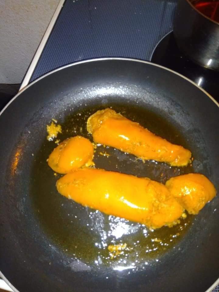 - Faites chauffer l’huile de palme rouge dans une poêle profonde à feu moyen.