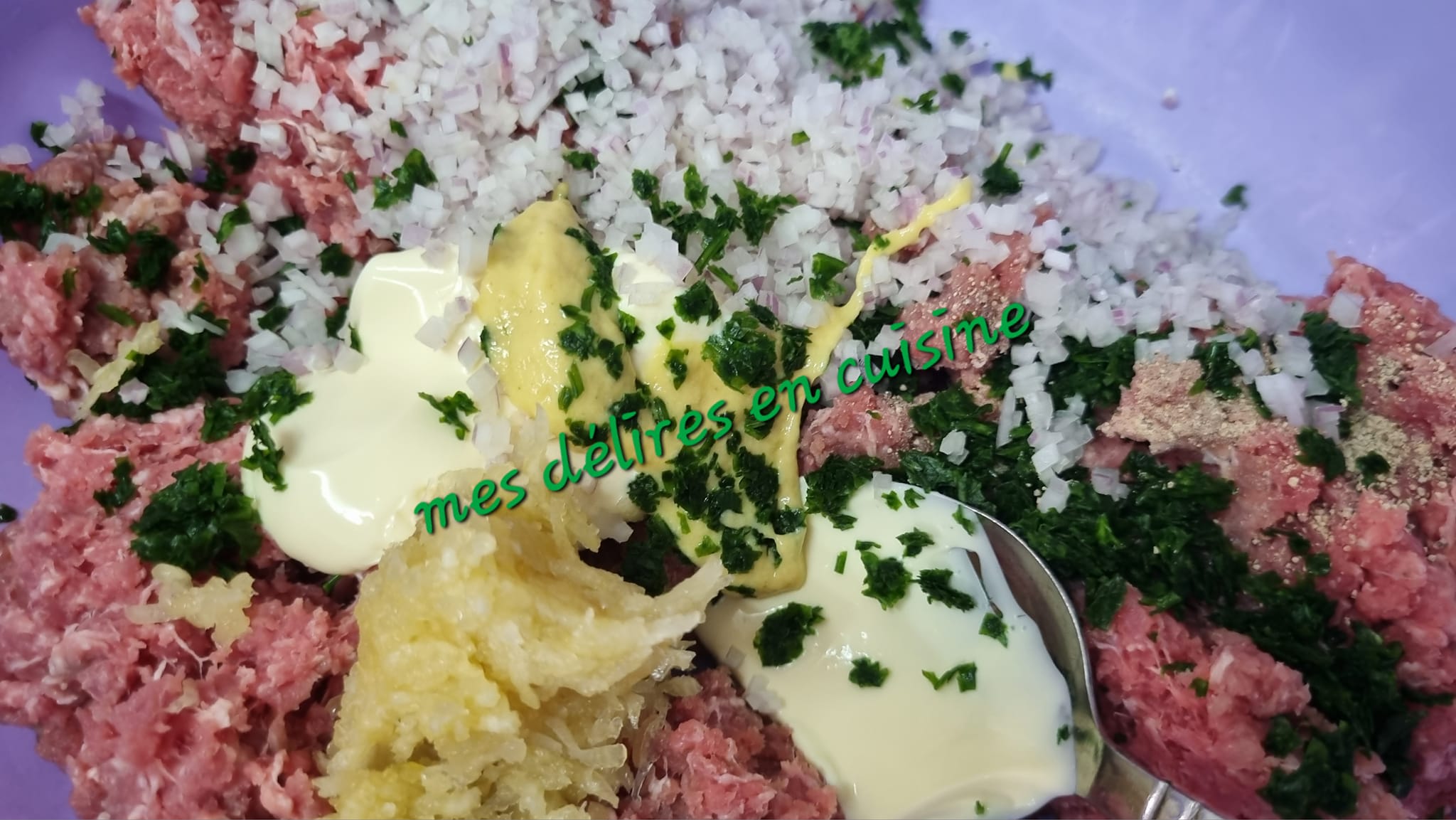 - Dans un grand bol, mélangez la viande hachée, le persil, l’ail, l’oignon, le pain trempé et essoré, l’œuf, le sel et le poivre.