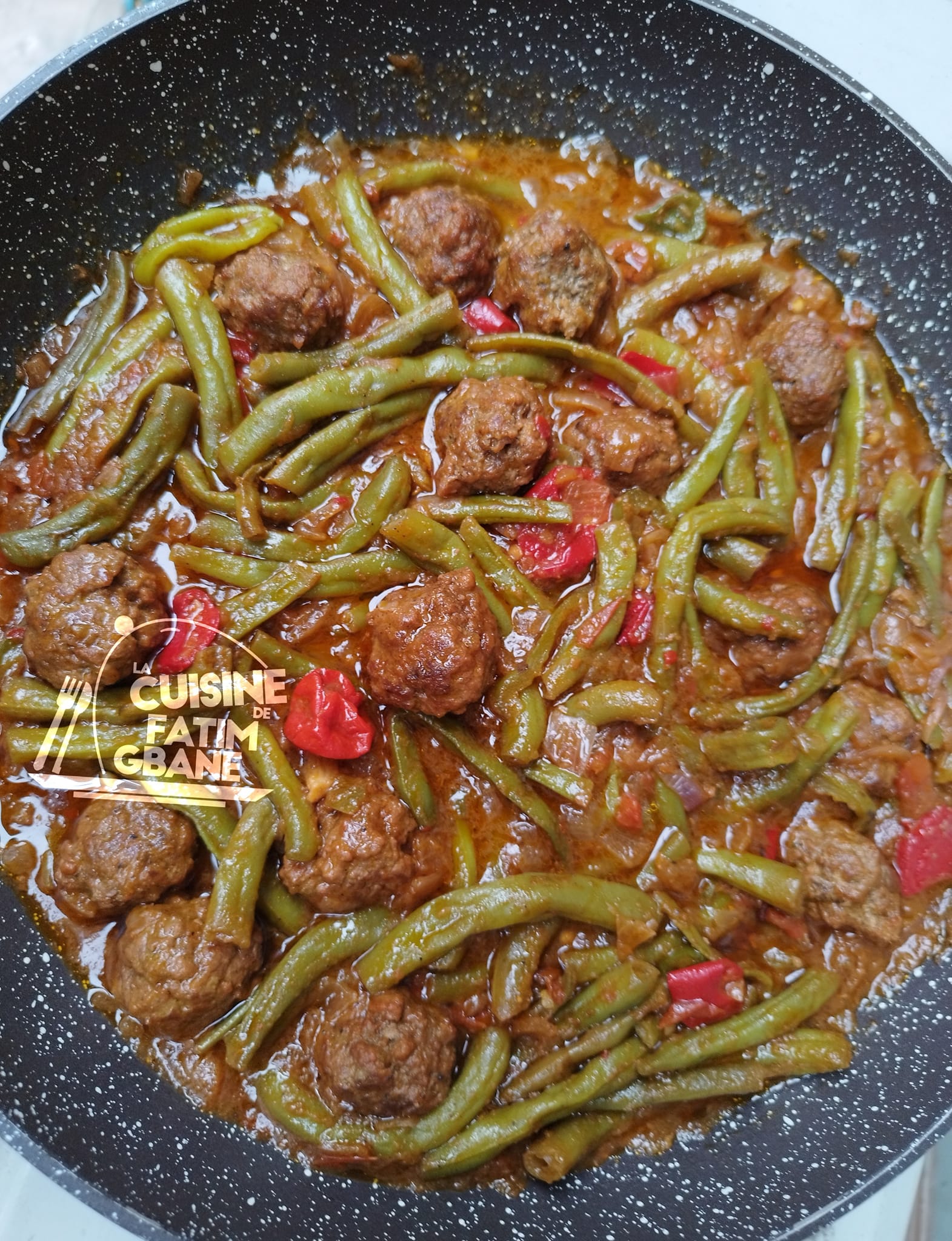 - Une fois les haricots verts cuits, ajoutez les boulettes de viande réservées.