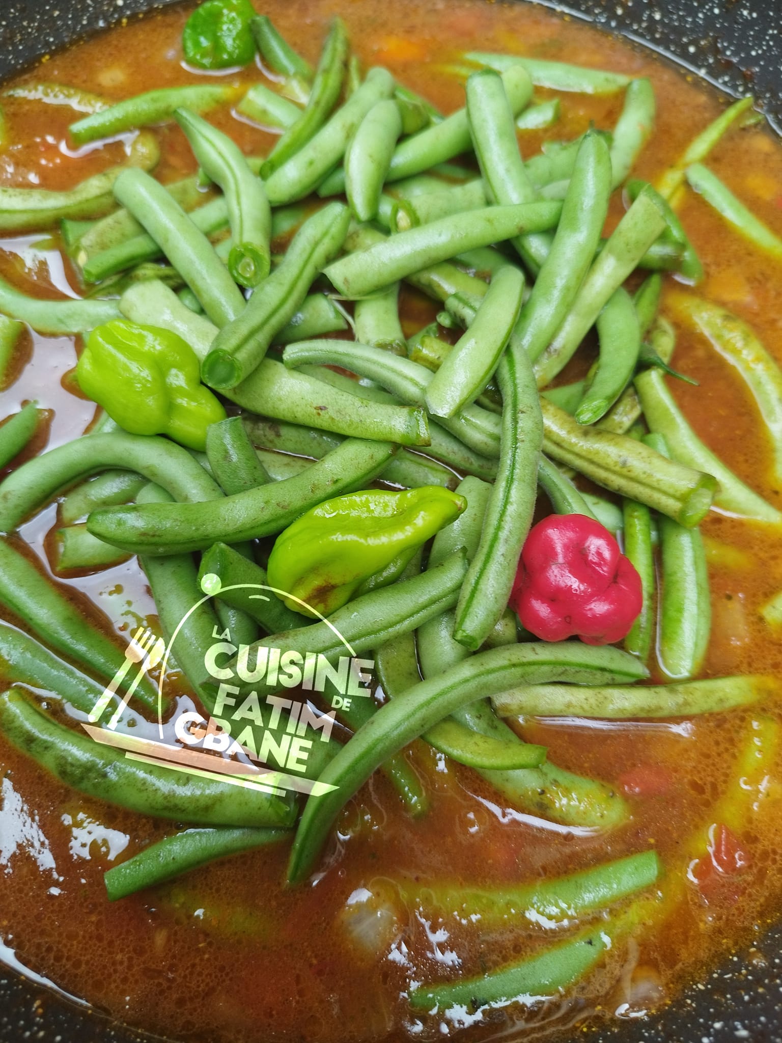 - Versez les haricots verts dans la poêle, ajoutez un peu d’eau si nécessaire, couvrez et laissez cuire jusqu’à ce qu’ils soient tendres mais encore croquants.