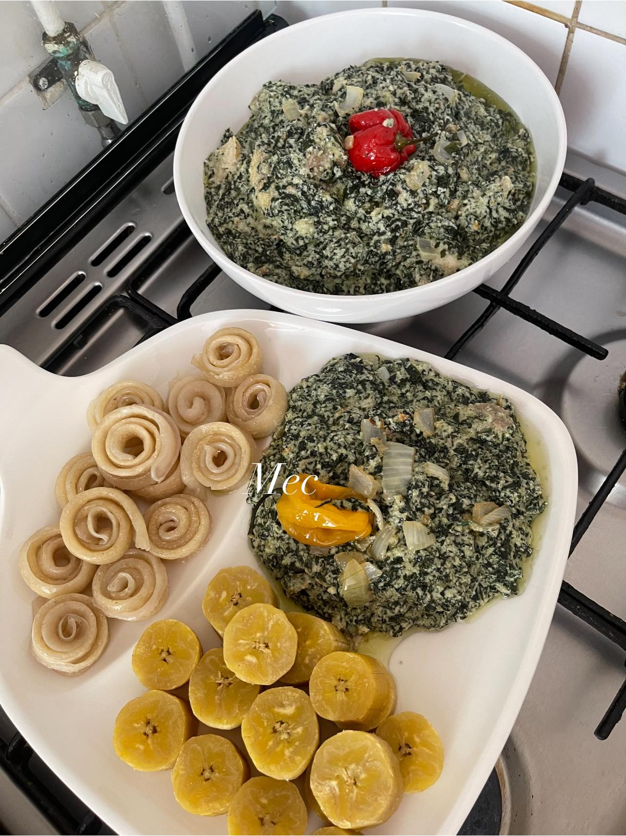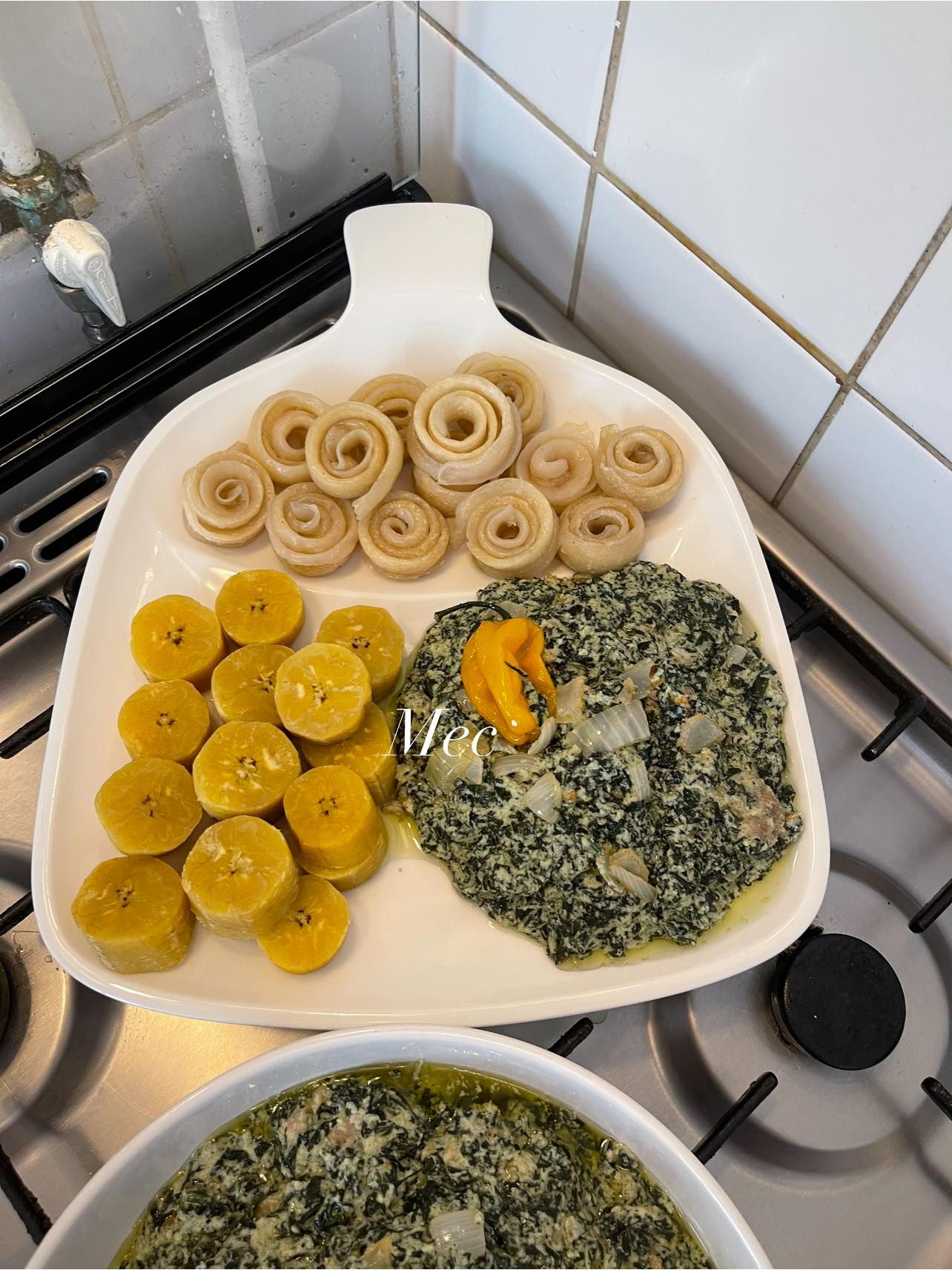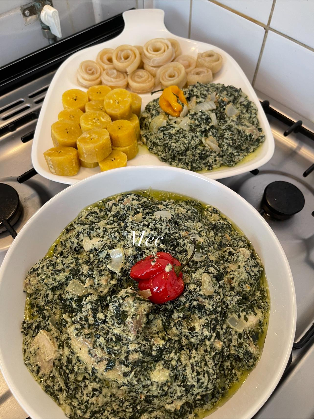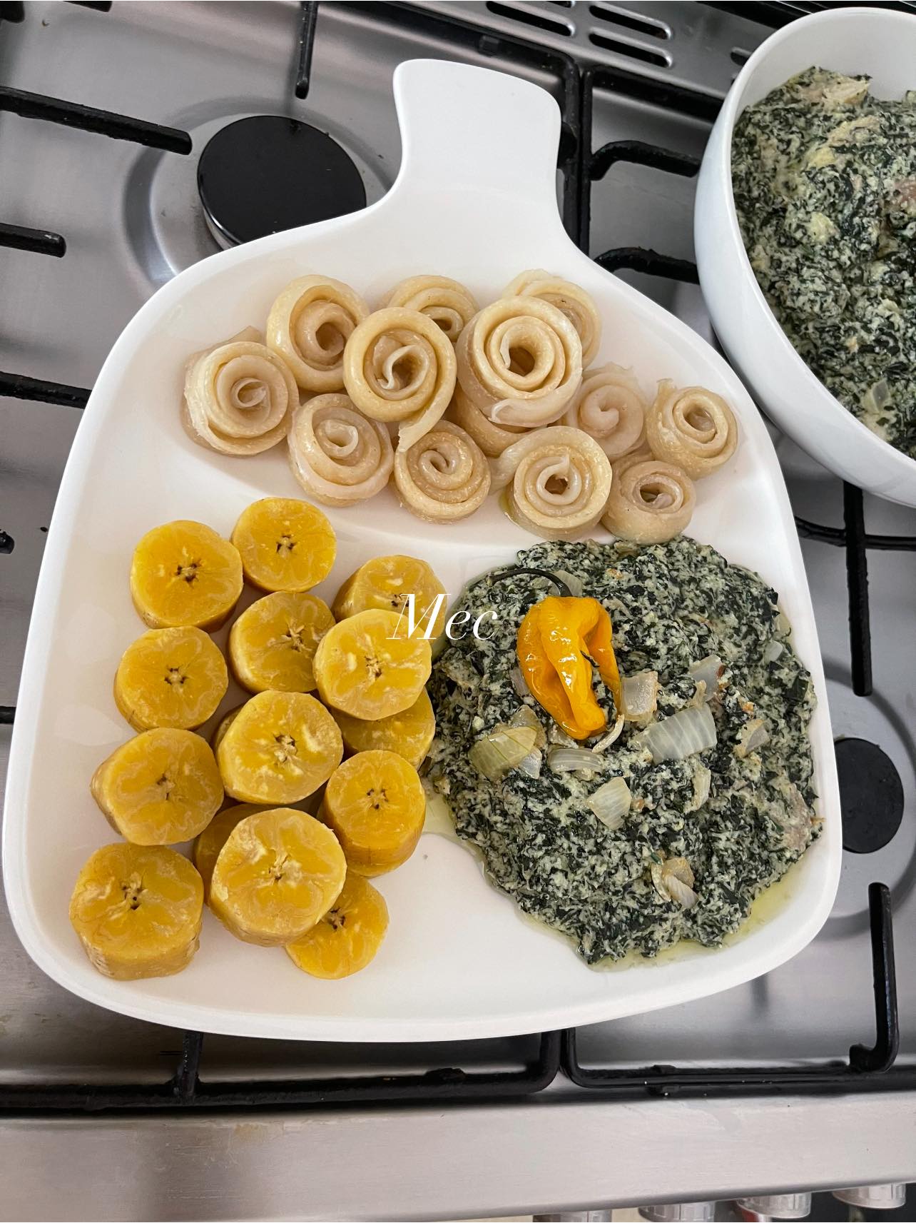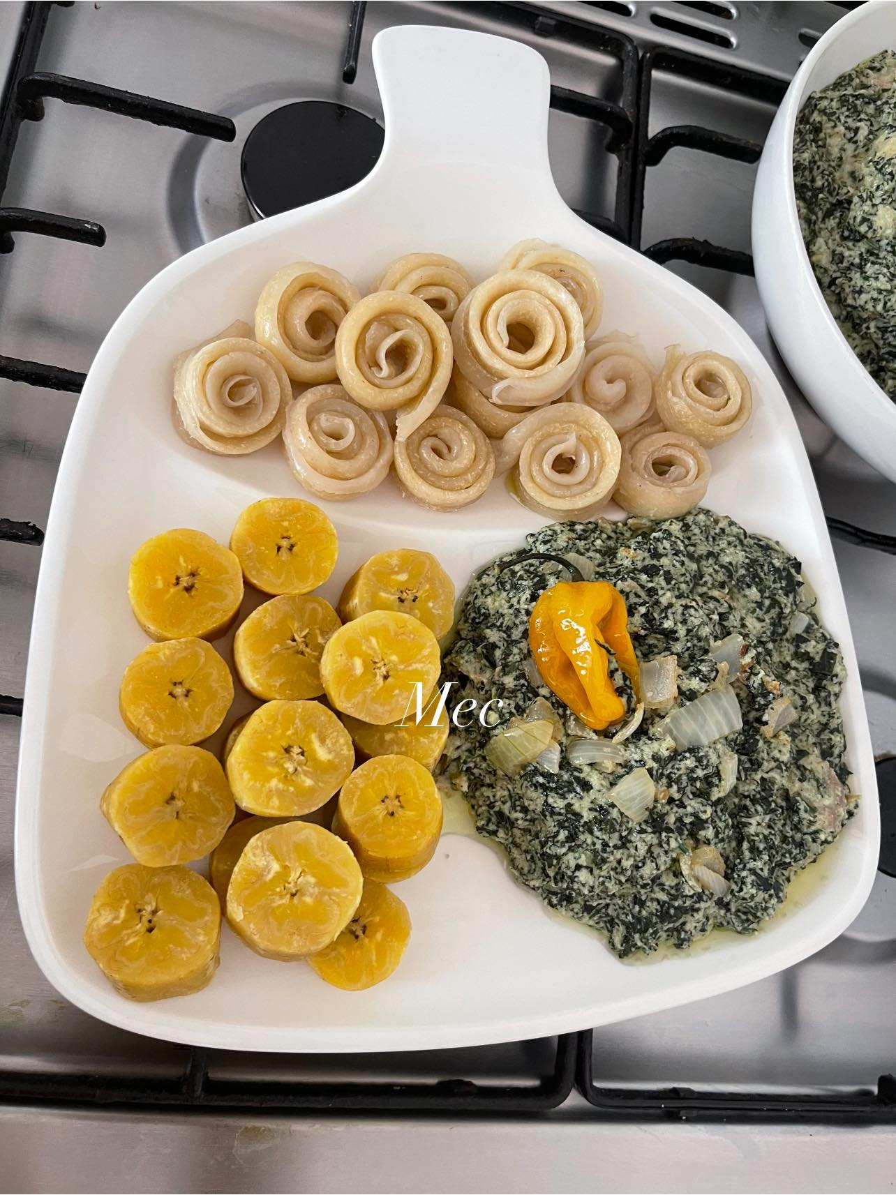 - Servez le ndolé chaud, accompagné de bananes plantains, d’ignames, de manioc ou de couscous de maïs, selon vos préférences.