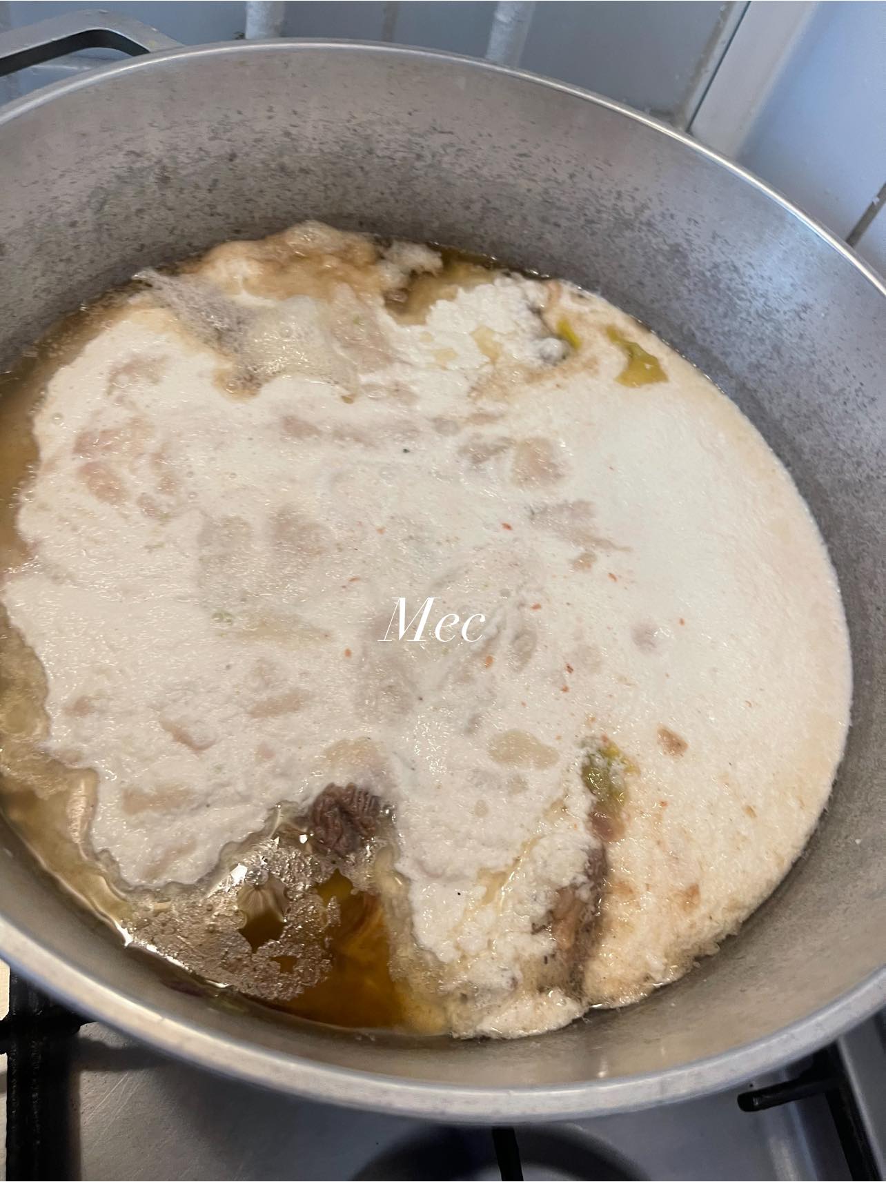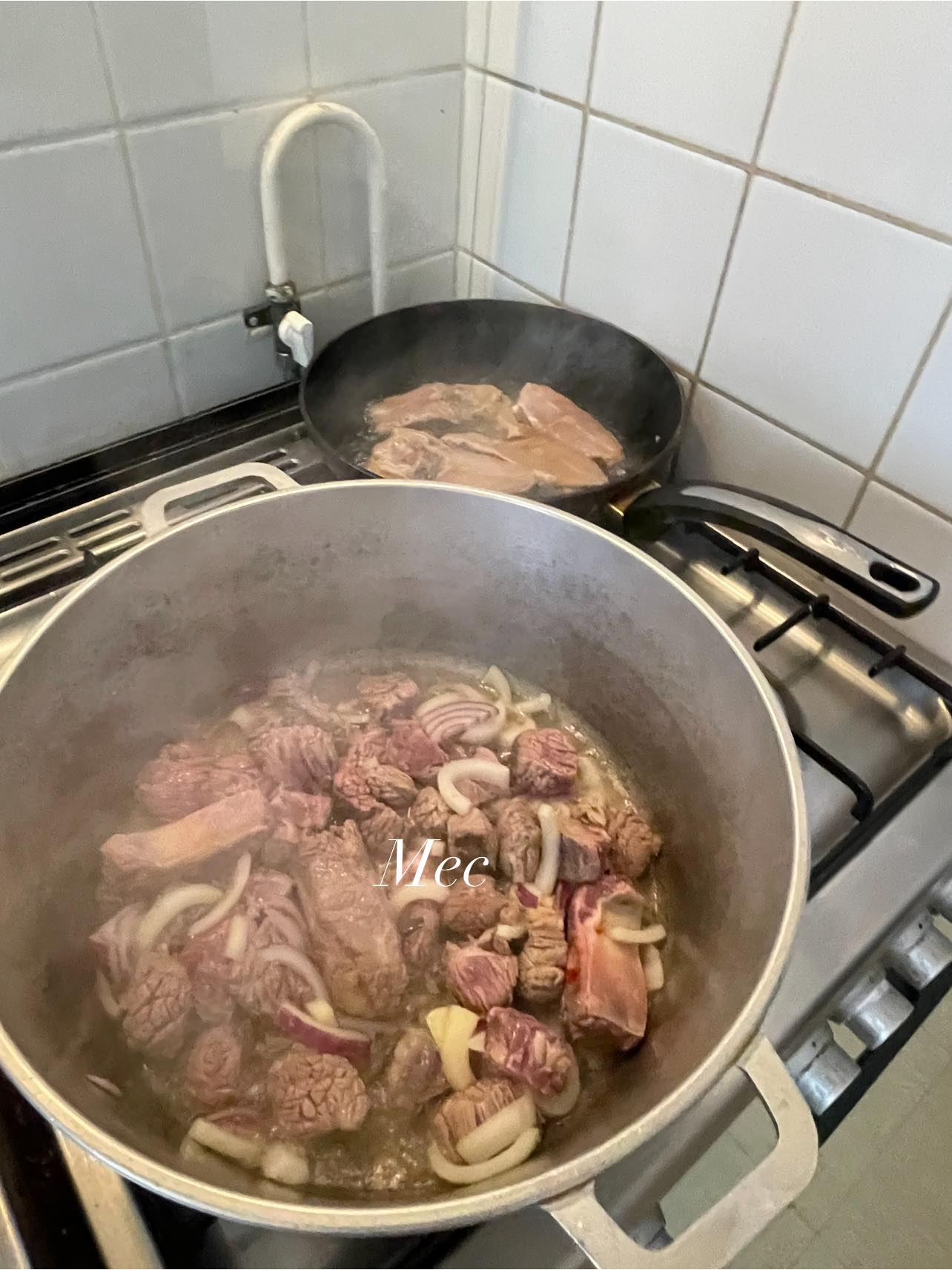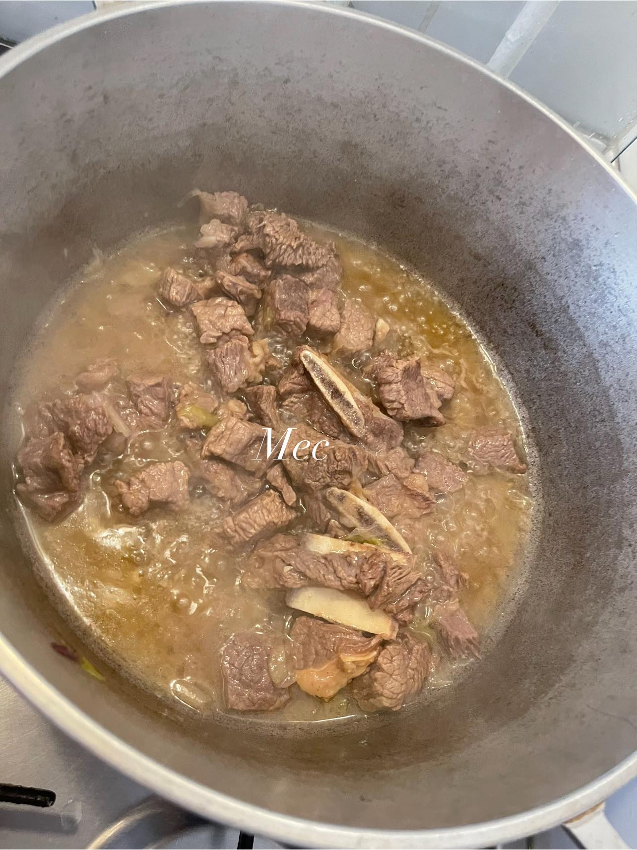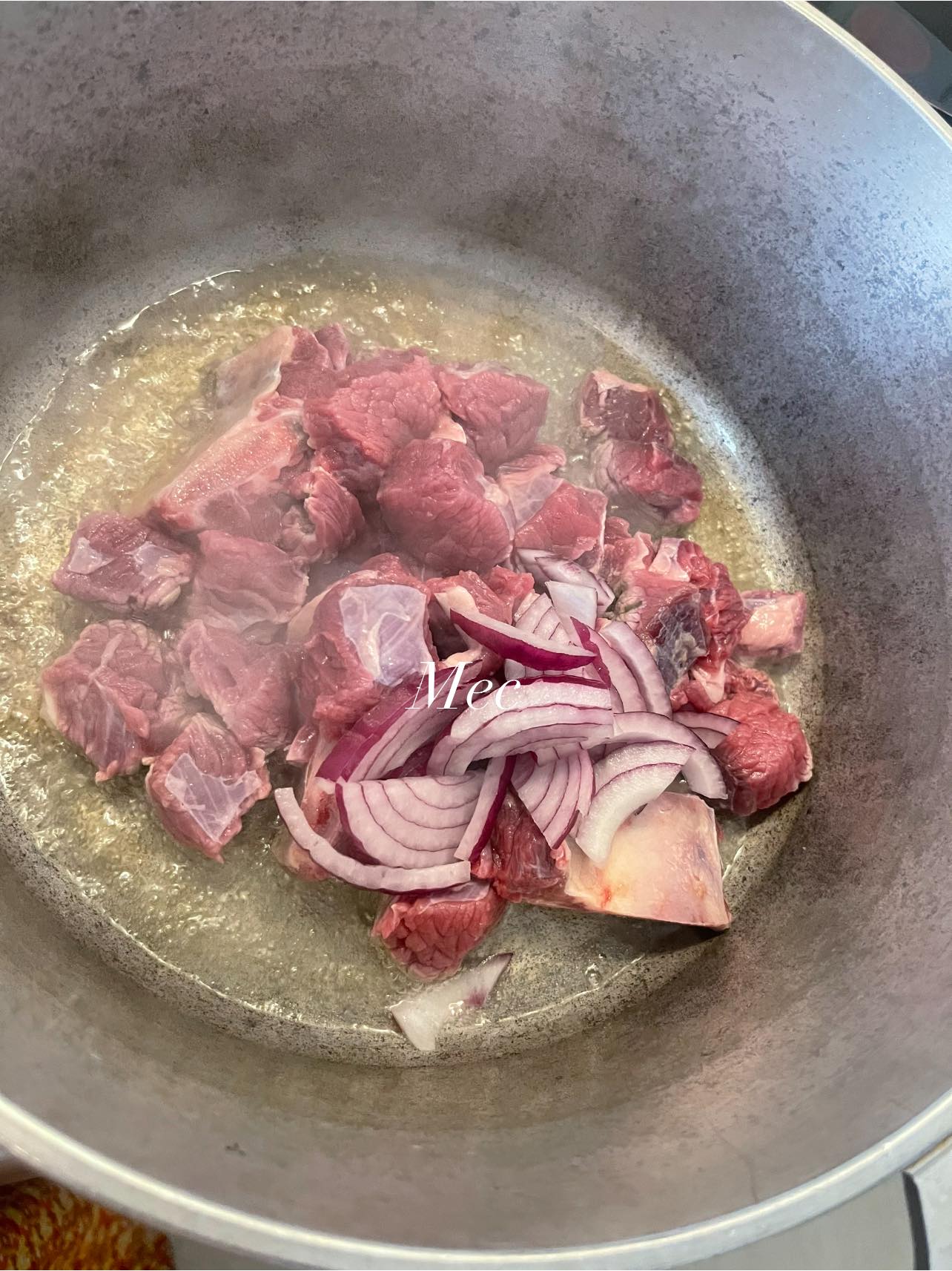 - Dans une grande marmite, faites bouillir la viande avec un filet d’huile, la moitié de l’oignon haché, du sel et suffisamment d’eau pour bien cuire la viande.