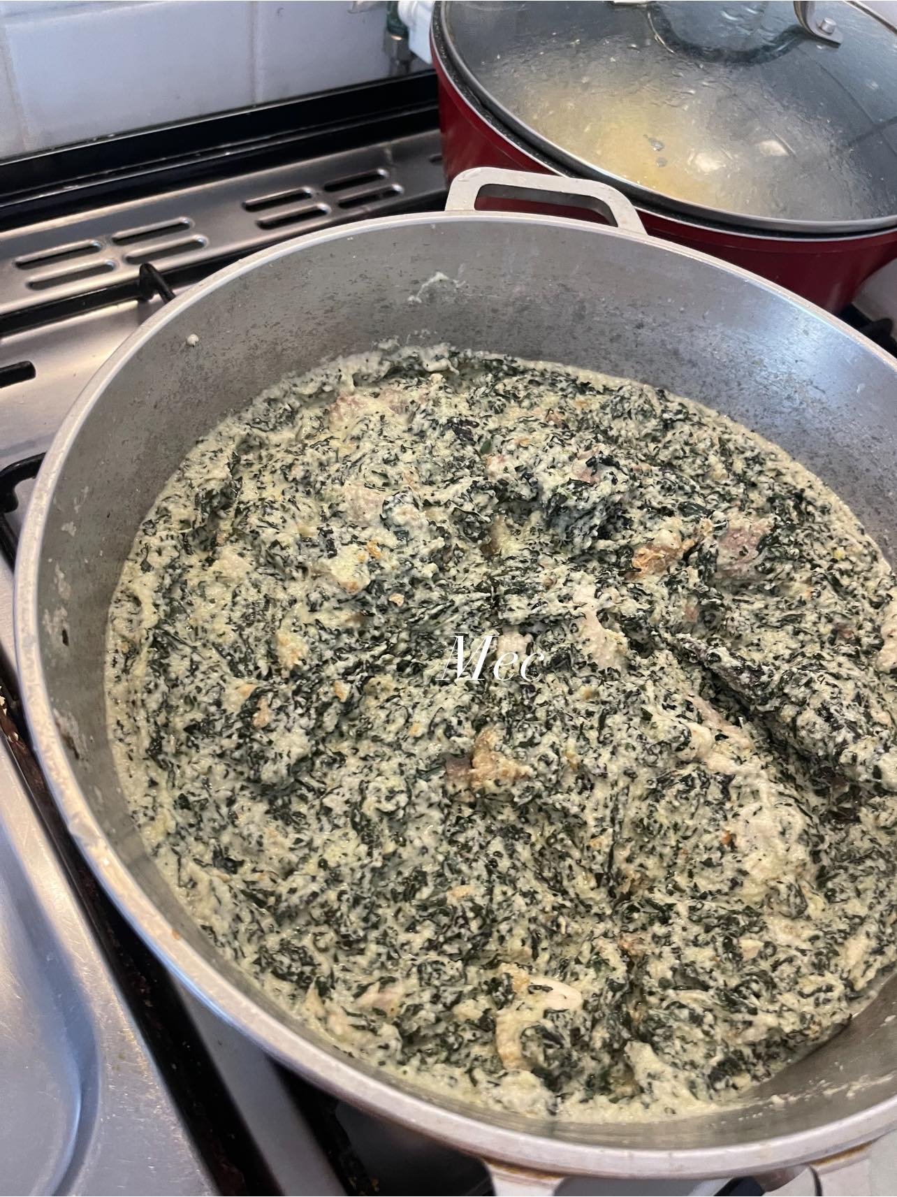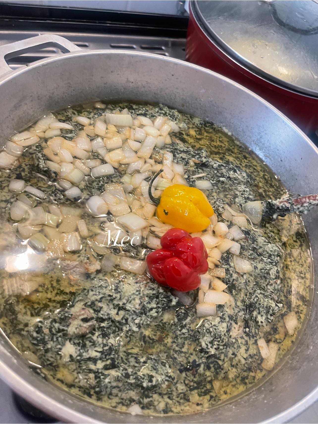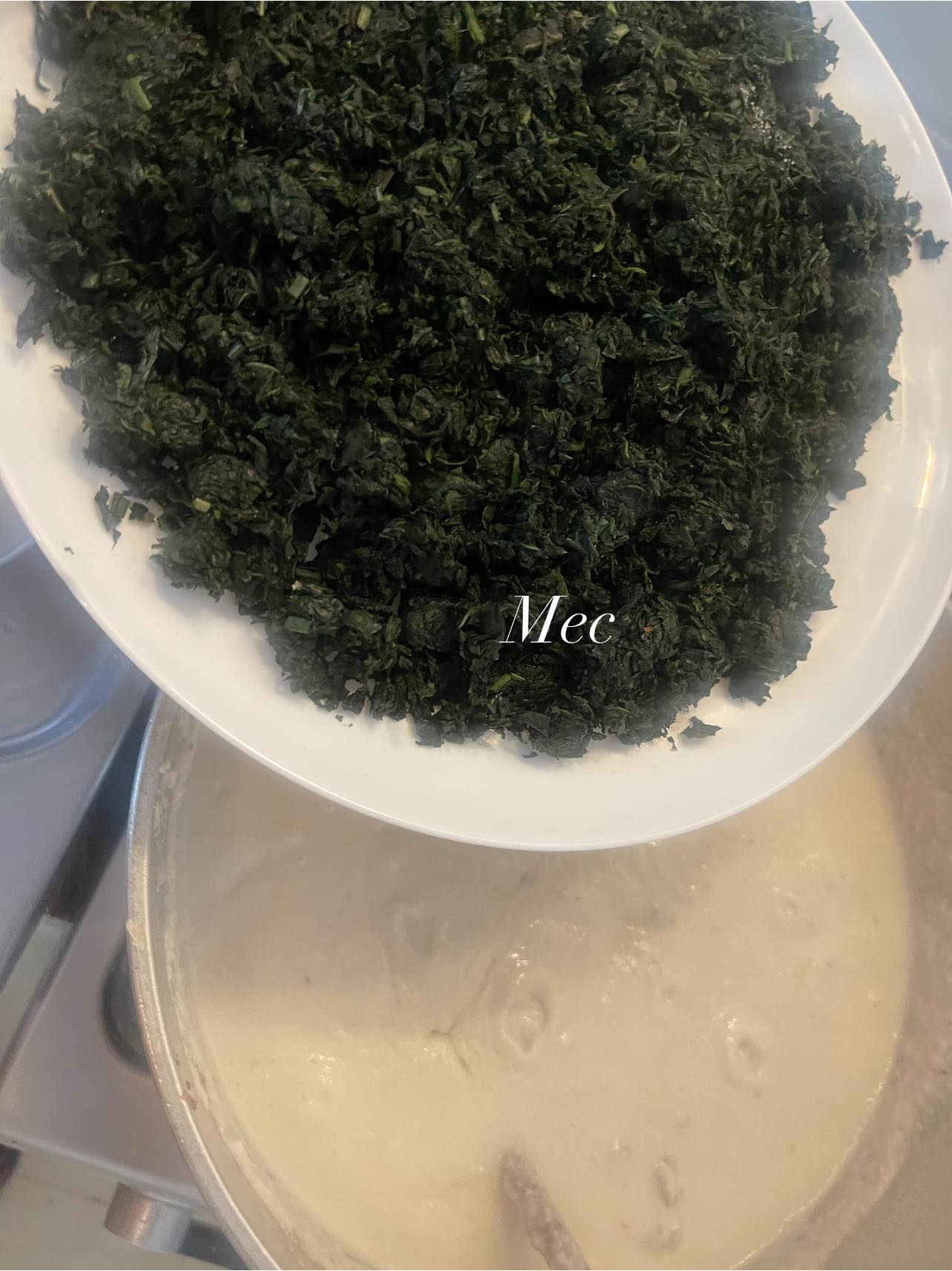 - Lorsque la sauce commence à former des bulles et des trous en surface, cela indique qu’elle est cuite. Ajoutez alors les feuilles de ndolé préalablement bien lavées.