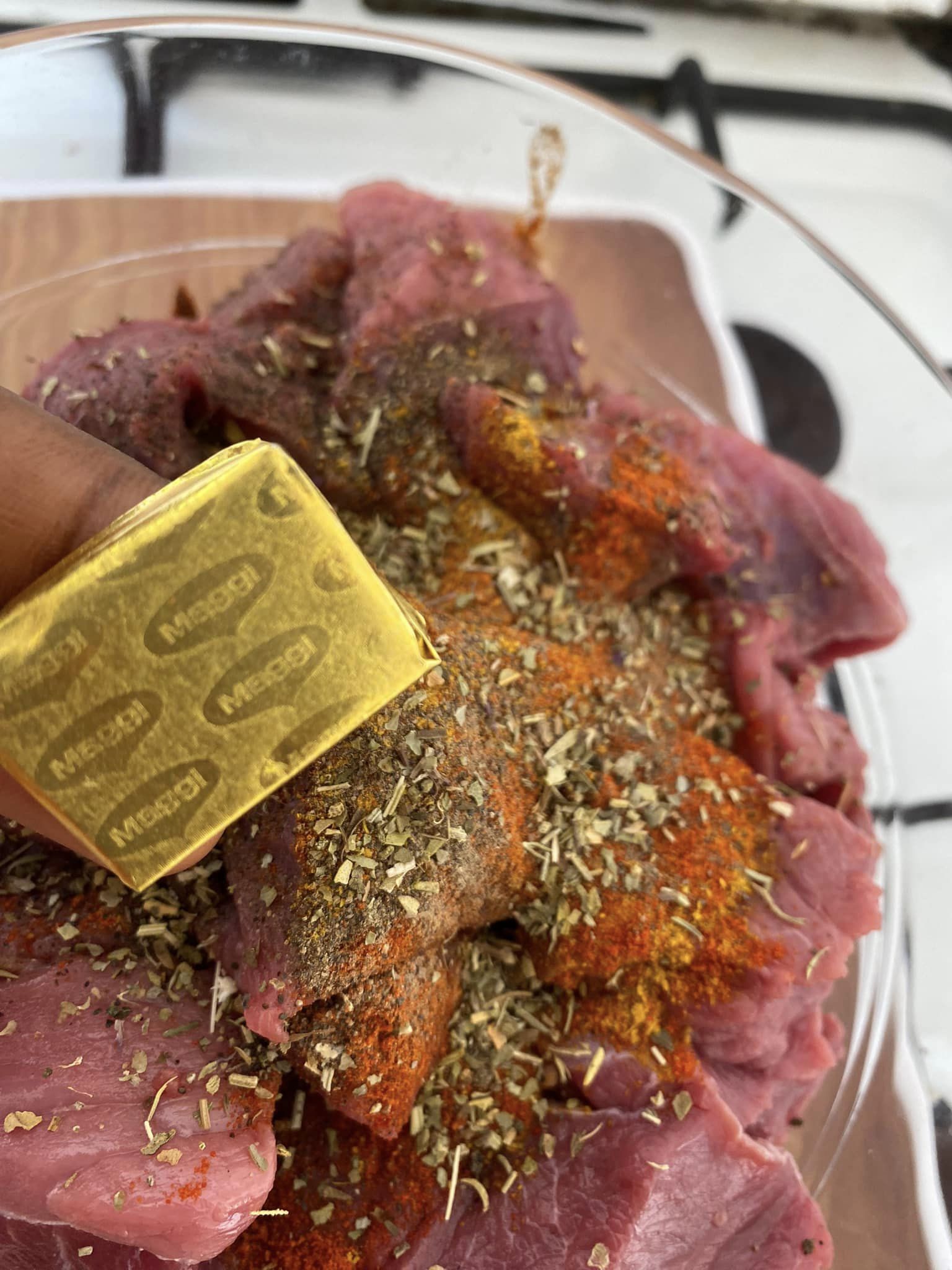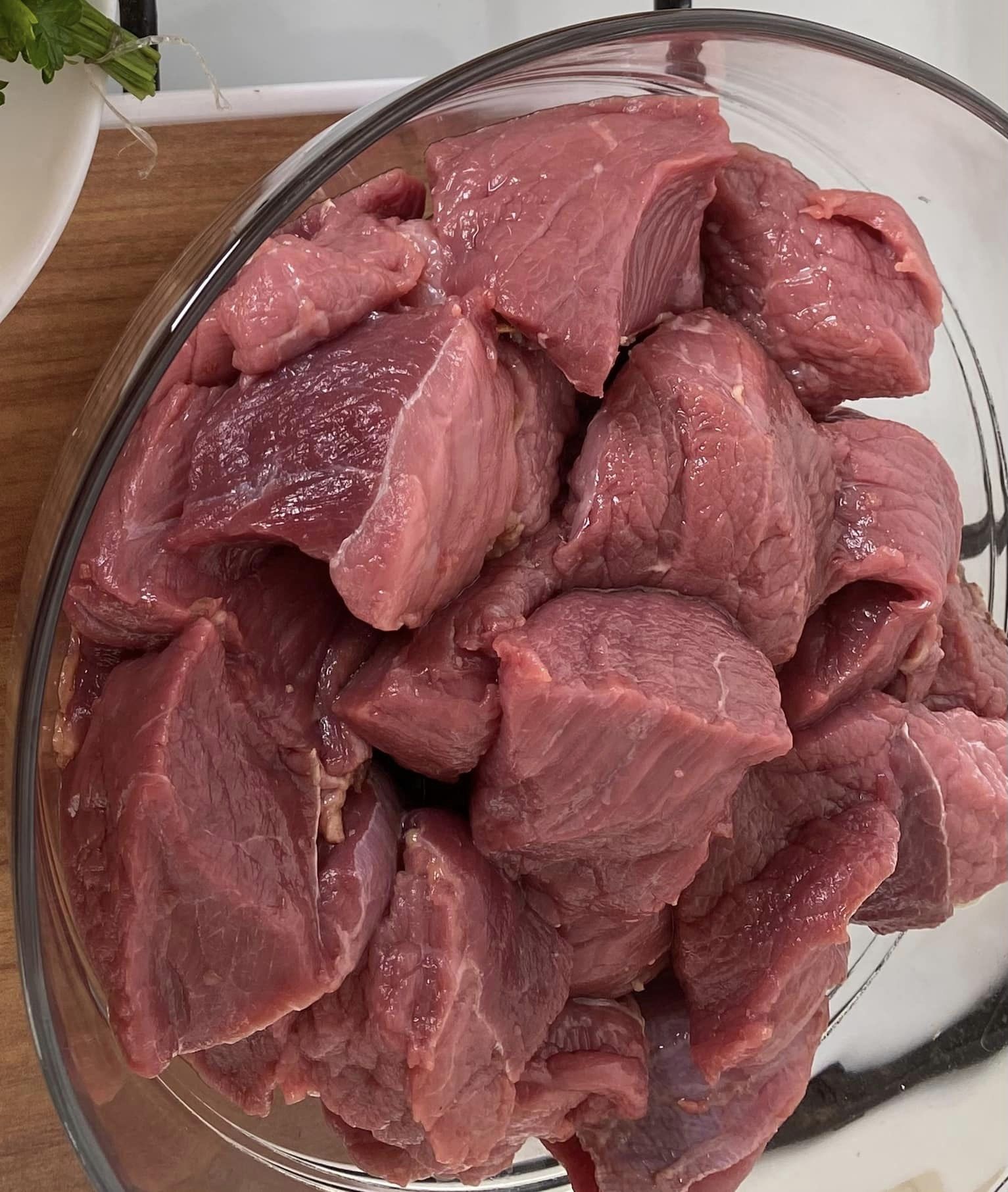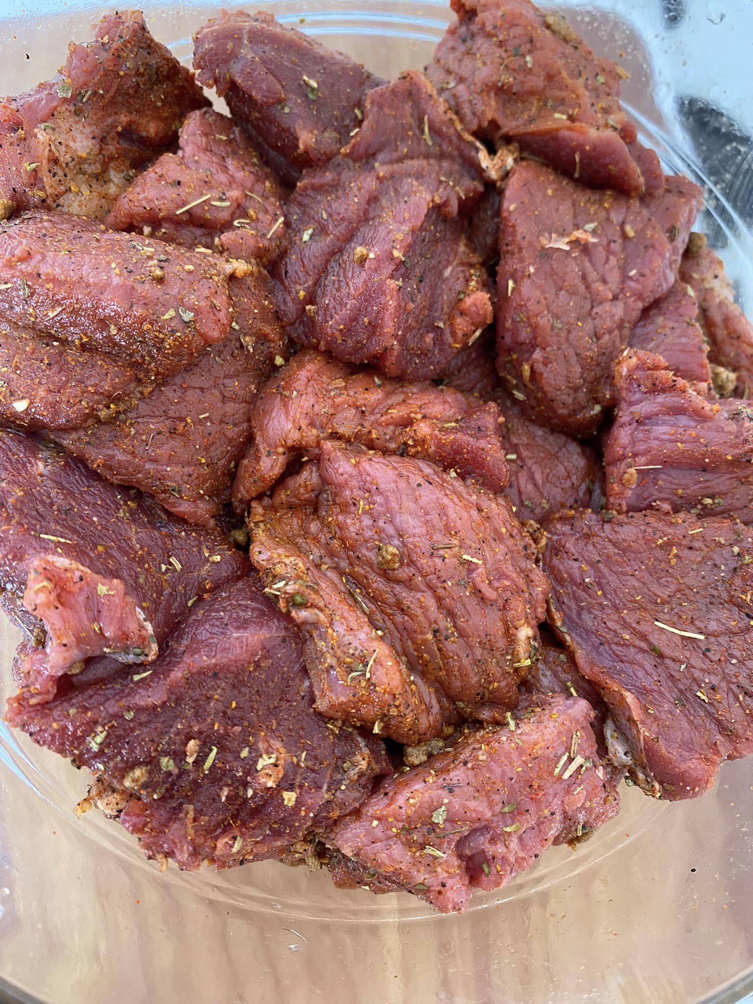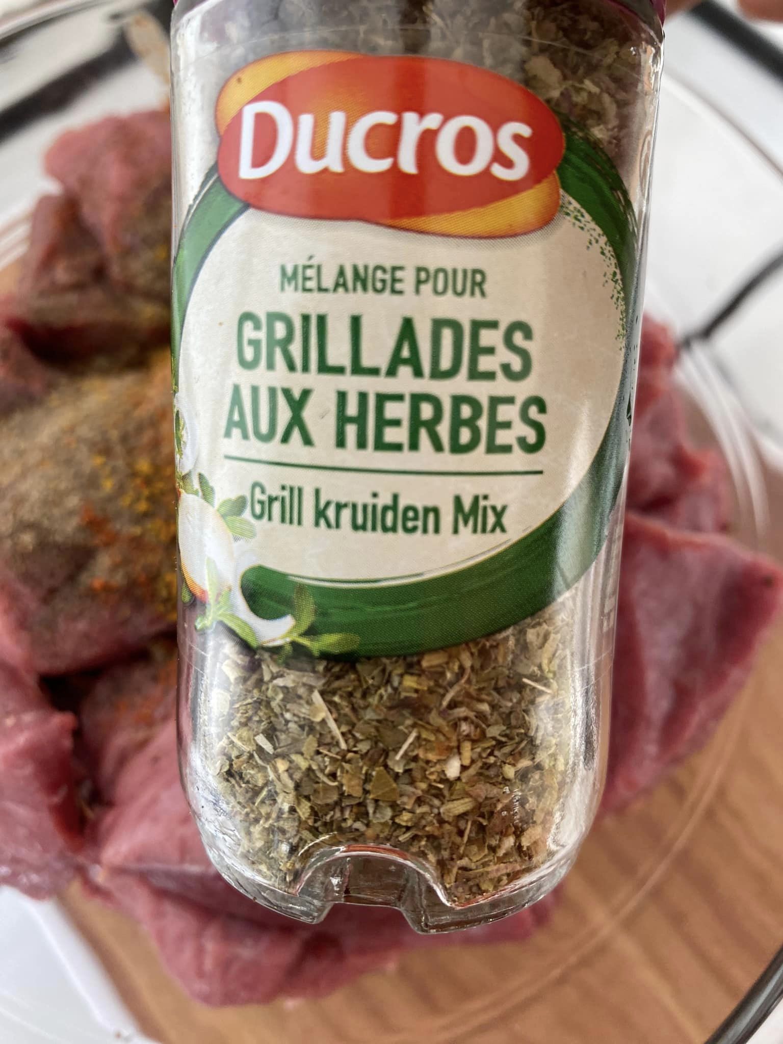 - Dans un bol, mélangez les morceaux de bœuf avec le poivre, le paprika, le curry, les herbes de Provence et le cube de bouillon émietté. Assurez-vous que la viande est bien enrobée de cet assaisonnement.