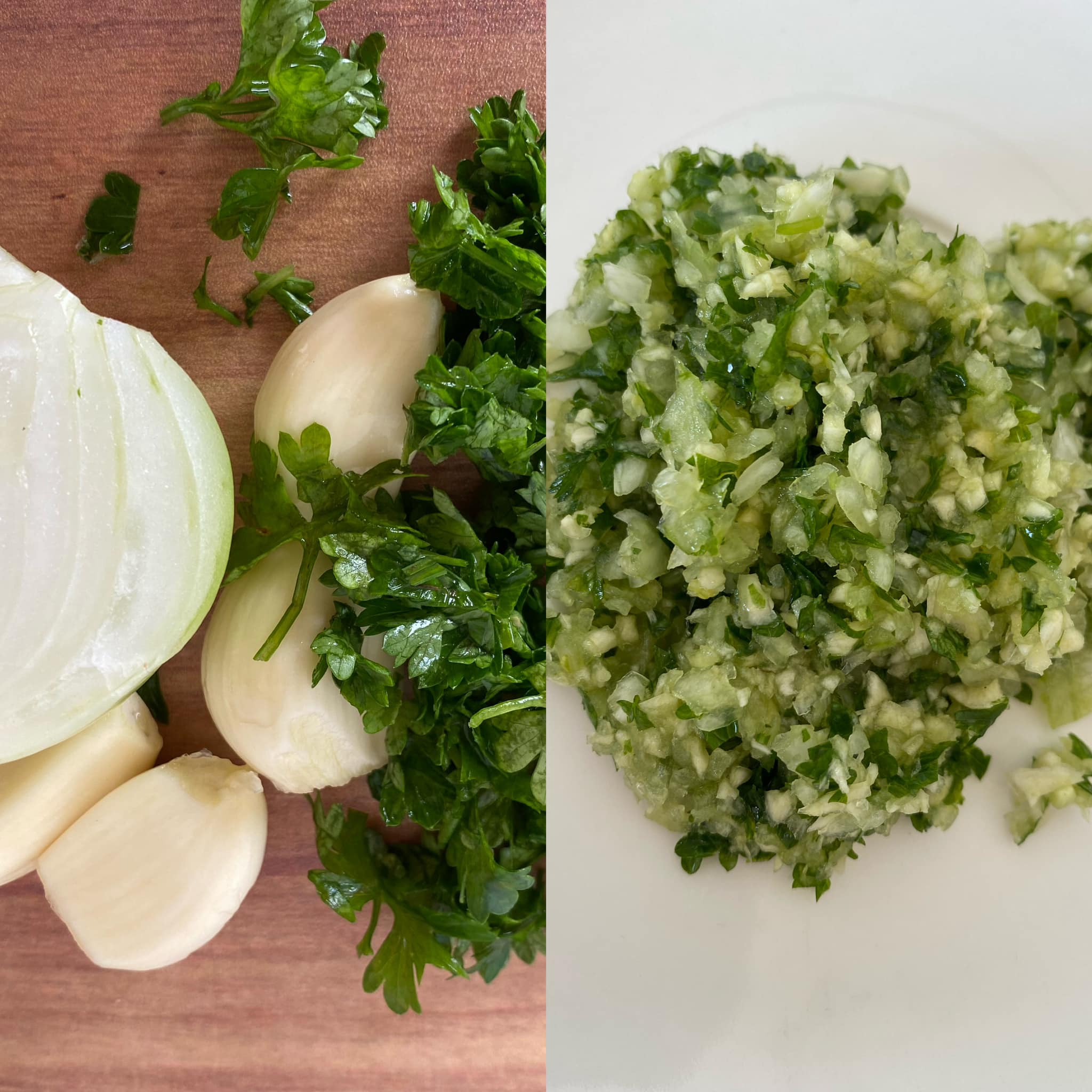 - Incorporez l’oignon émincé, l’ail et le persil hachés à la poêle.