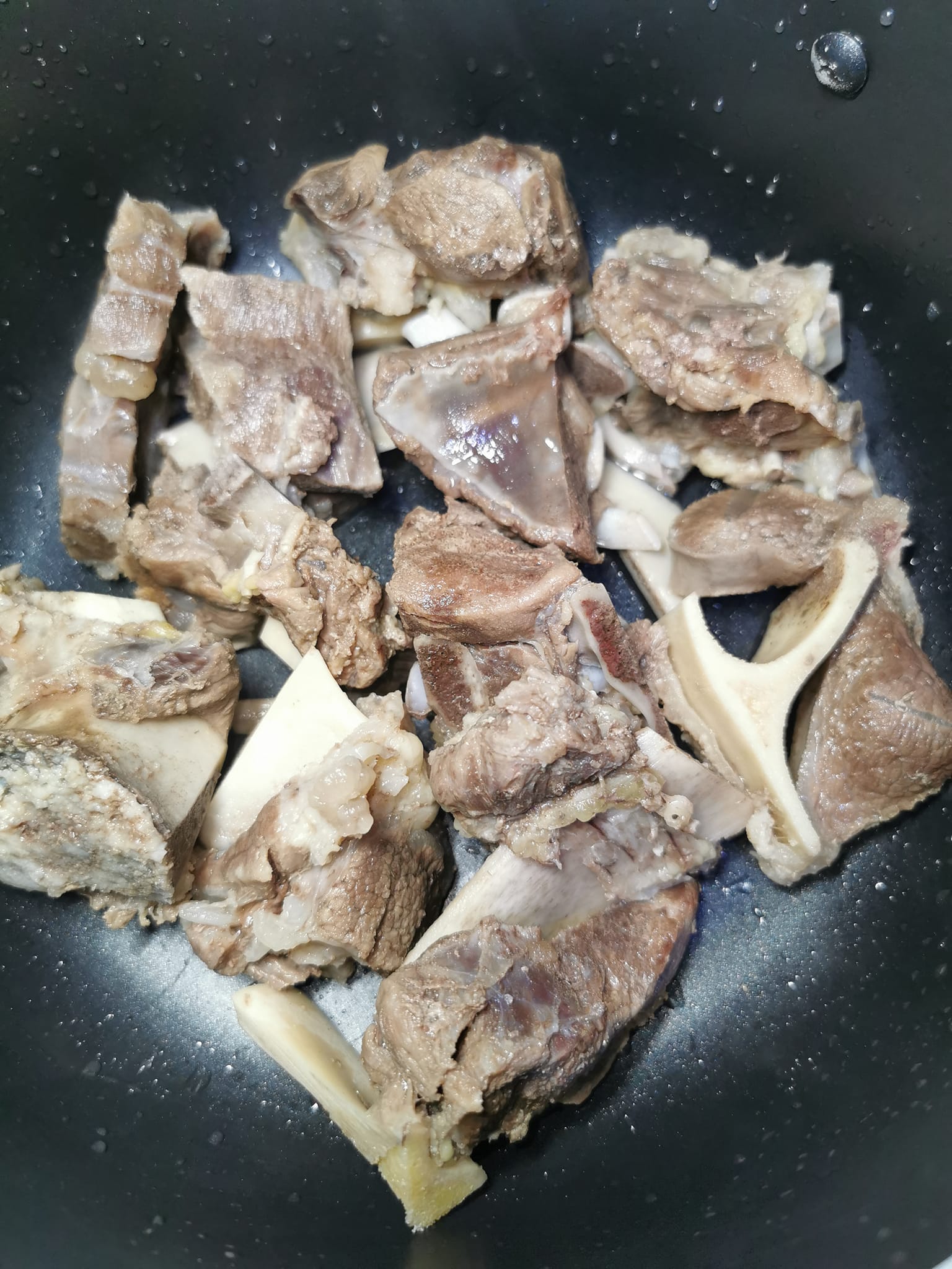 - Dans une marmite, placez les morceaux de bœuf précuits.