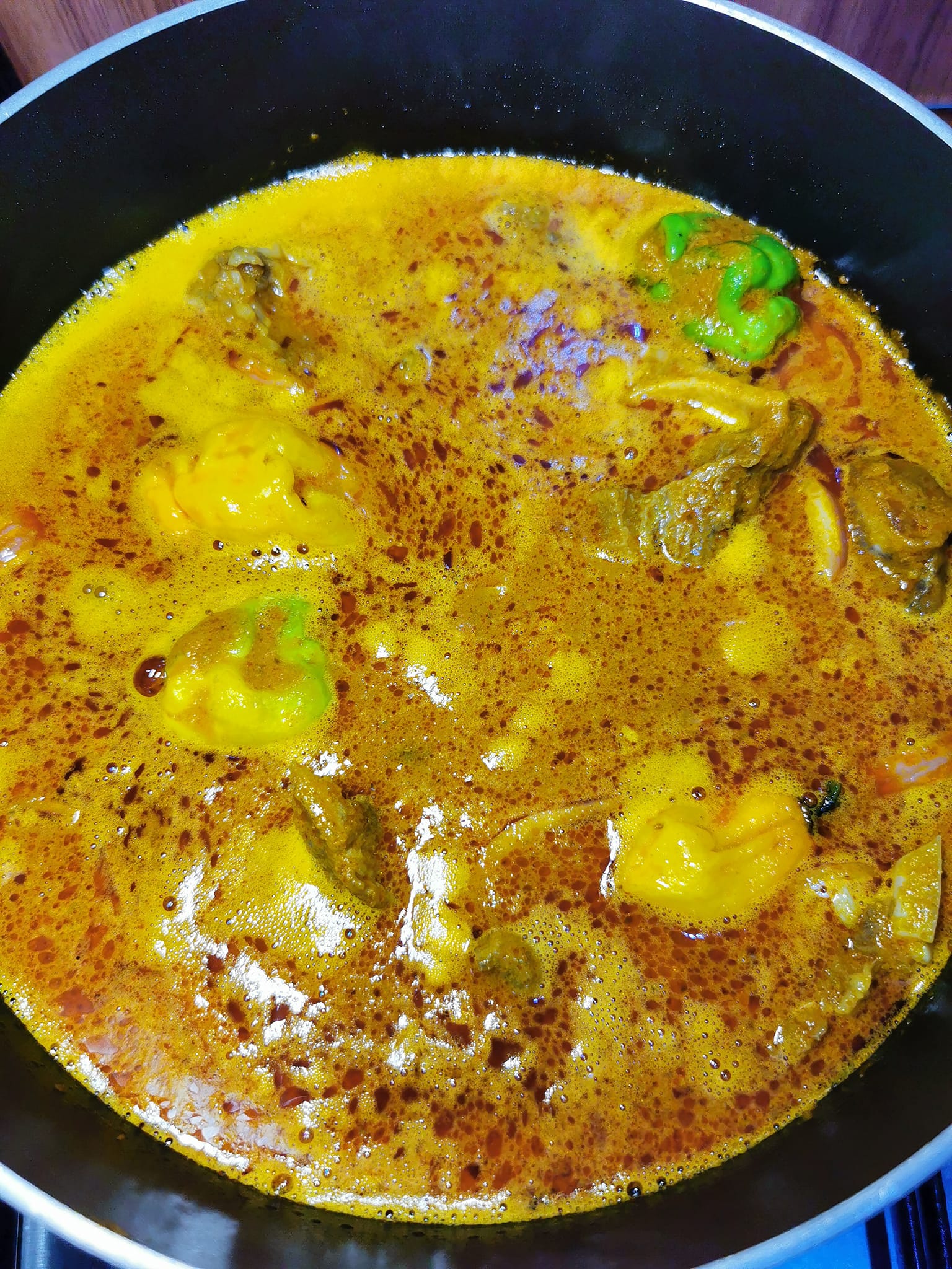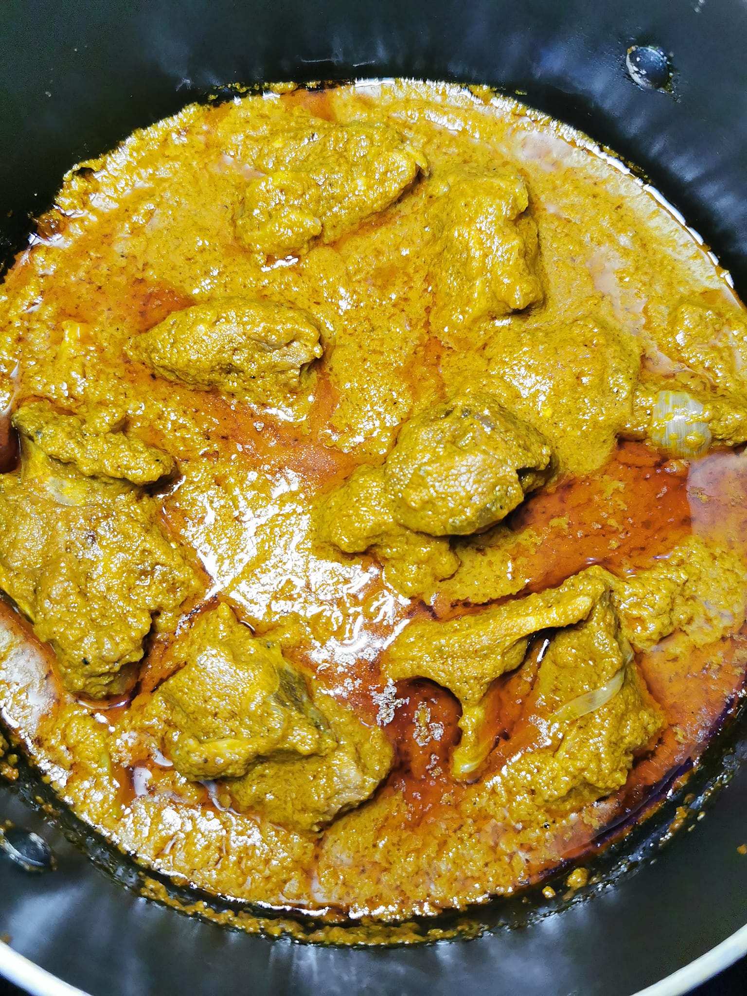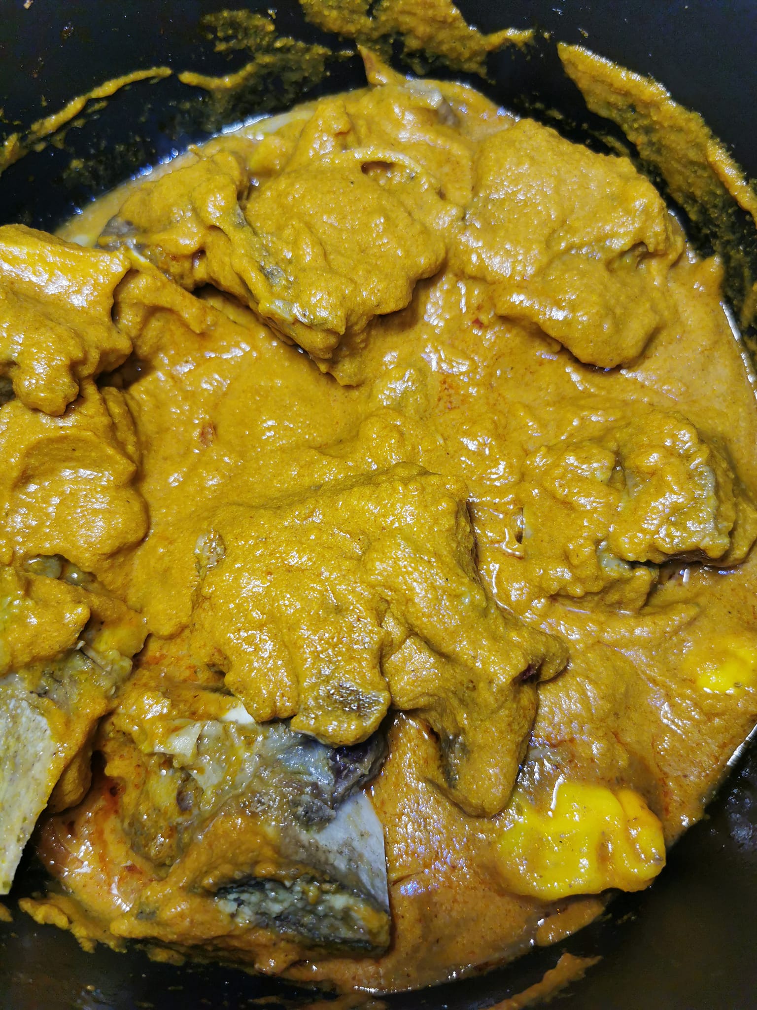 - Laissez mijoter pendant environ 30 minutes, en remuant de temps en temps, jusqu’à ce que l’huile de palme remonte à la surface, signe que la sauce est prête.