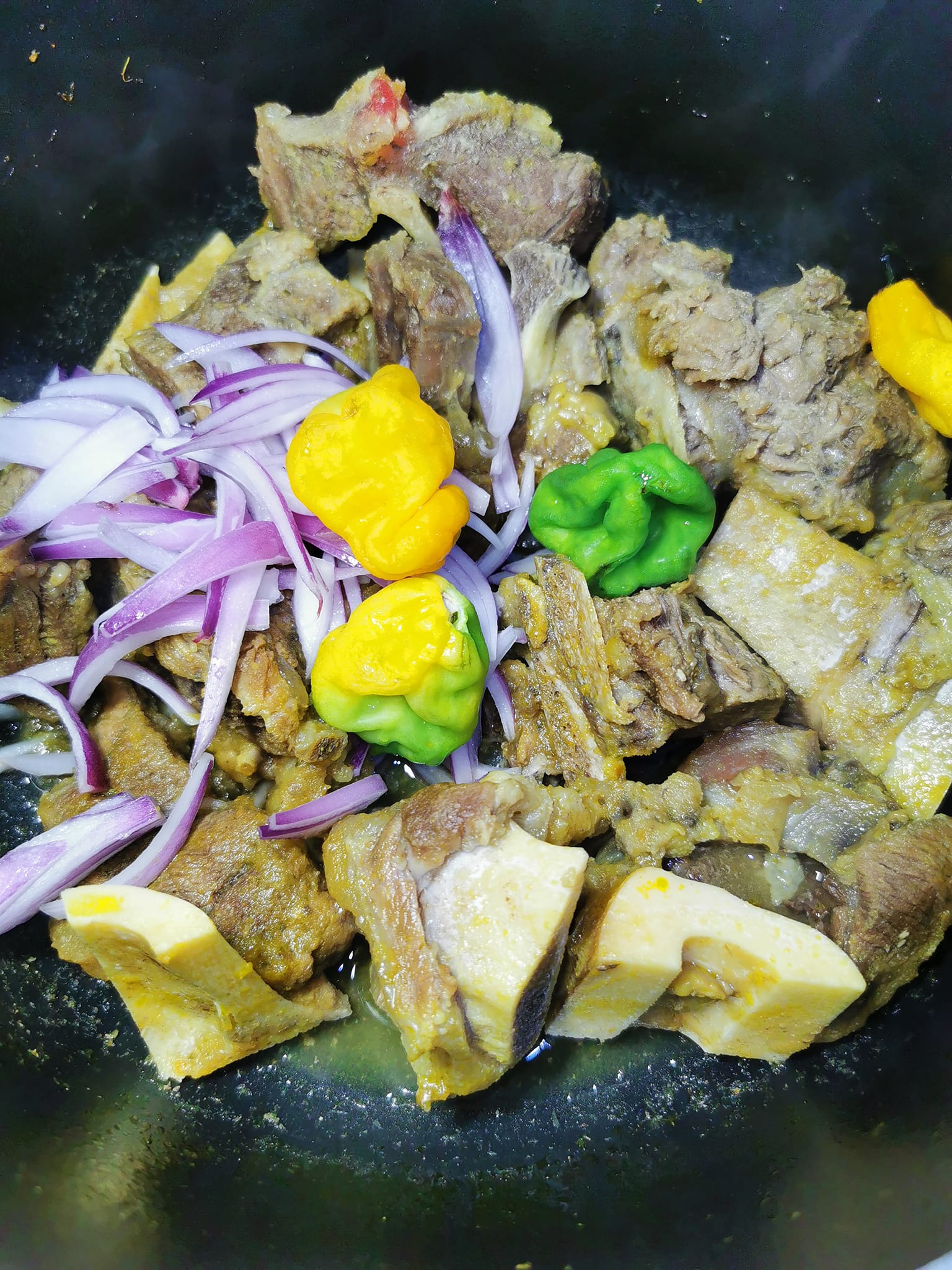 - Incorporez les oignons émincés et les piments entiers dans la marmite.