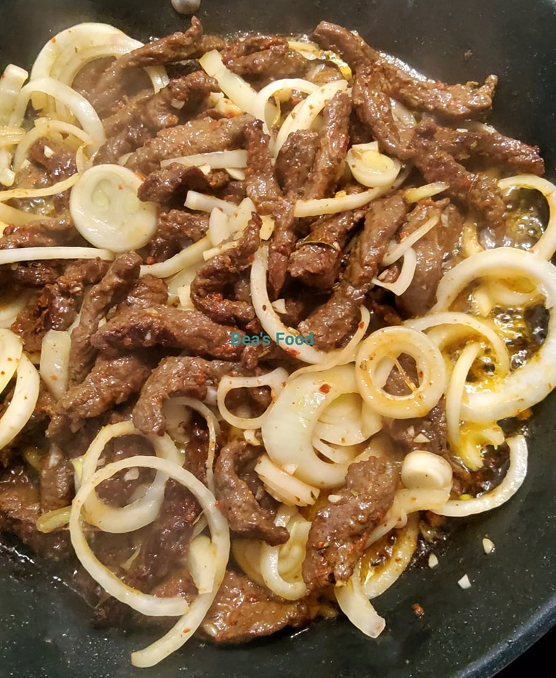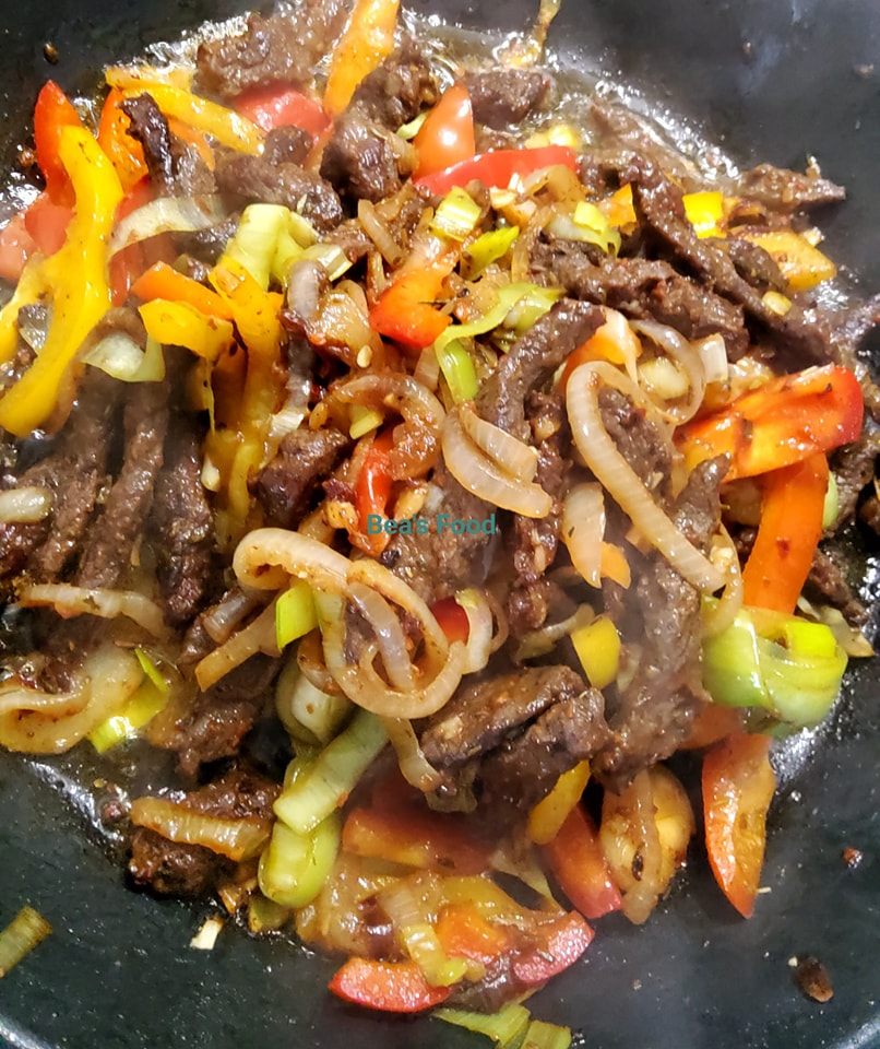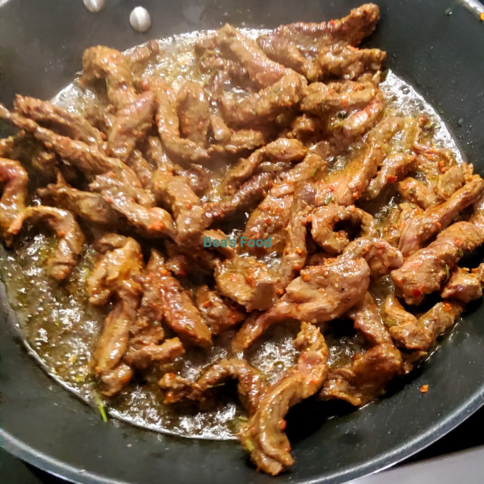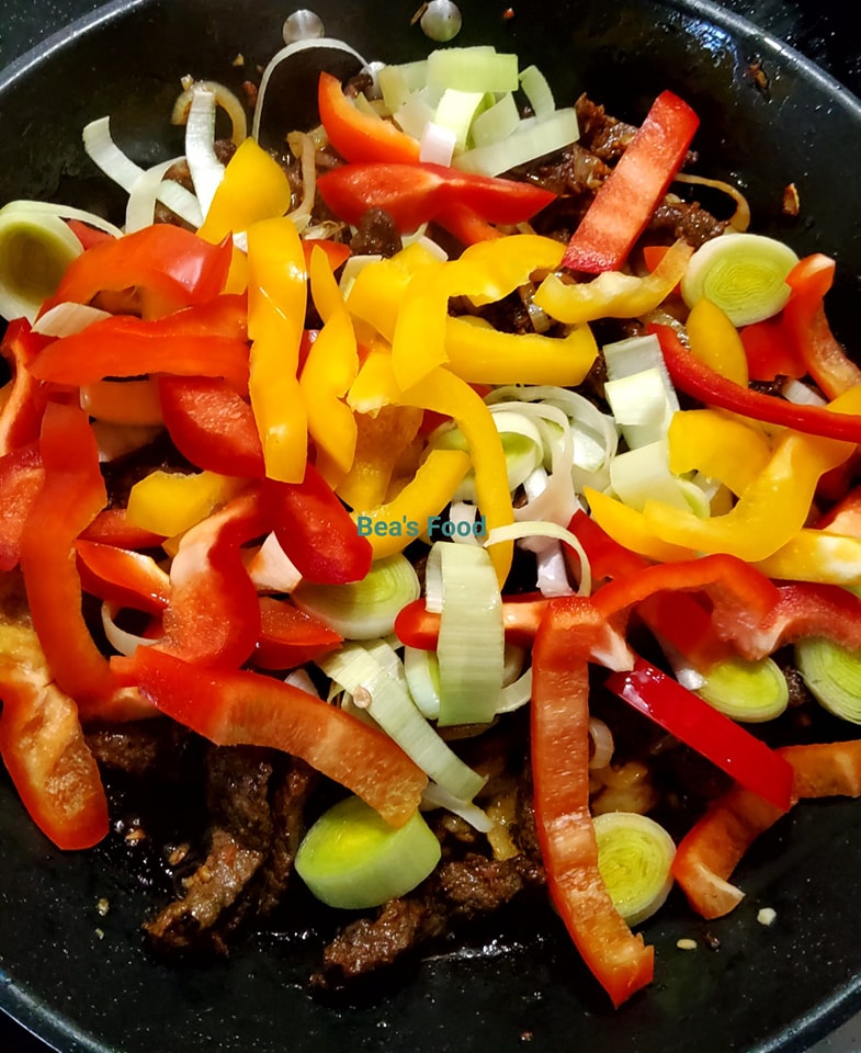 - Ajoutez les lamelles de bœuf marinées et faites-les sauter pendant environ 5 à 7 minutes, en remuant régulièrement, jusqu’à ce qu’elles soient bien dorées.