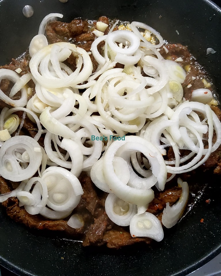 - Ajoutez les lamelles de bœuf, salez selon votre goût, et mélangez bien pour enrober uniformément la viande.