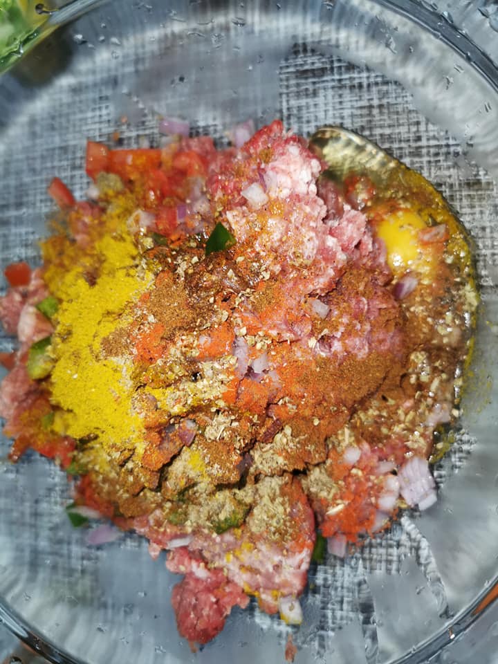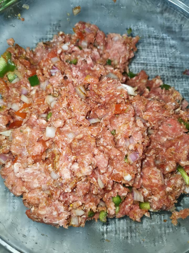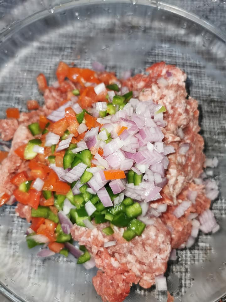 - Dans un grand bol, mélangez la viande hachée avec l’oignon haché, le poivron et les tomates en dés.