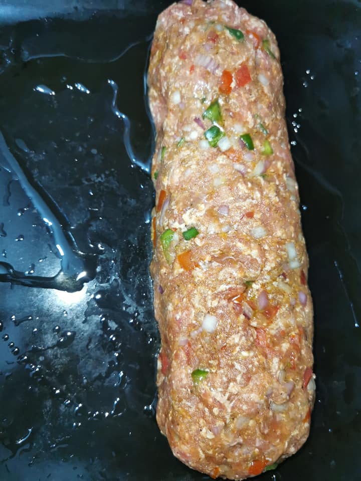 - Sur une plaque de cuisson légèrement huilée ou dans un plat allant au four, déposez la moitié du mélange de viande en formant un rectangle.