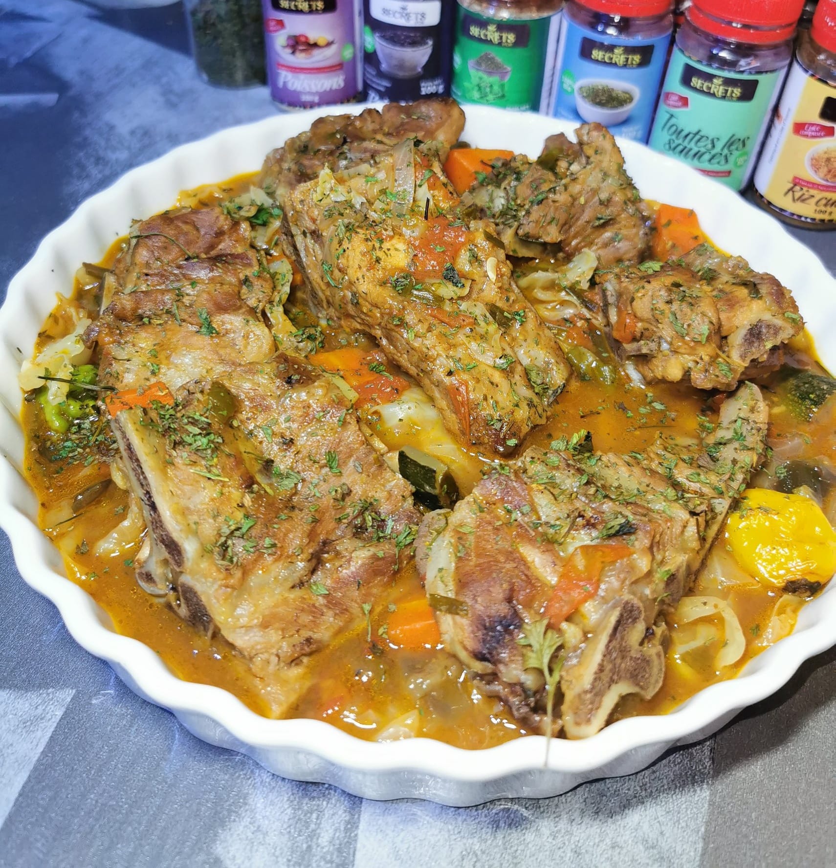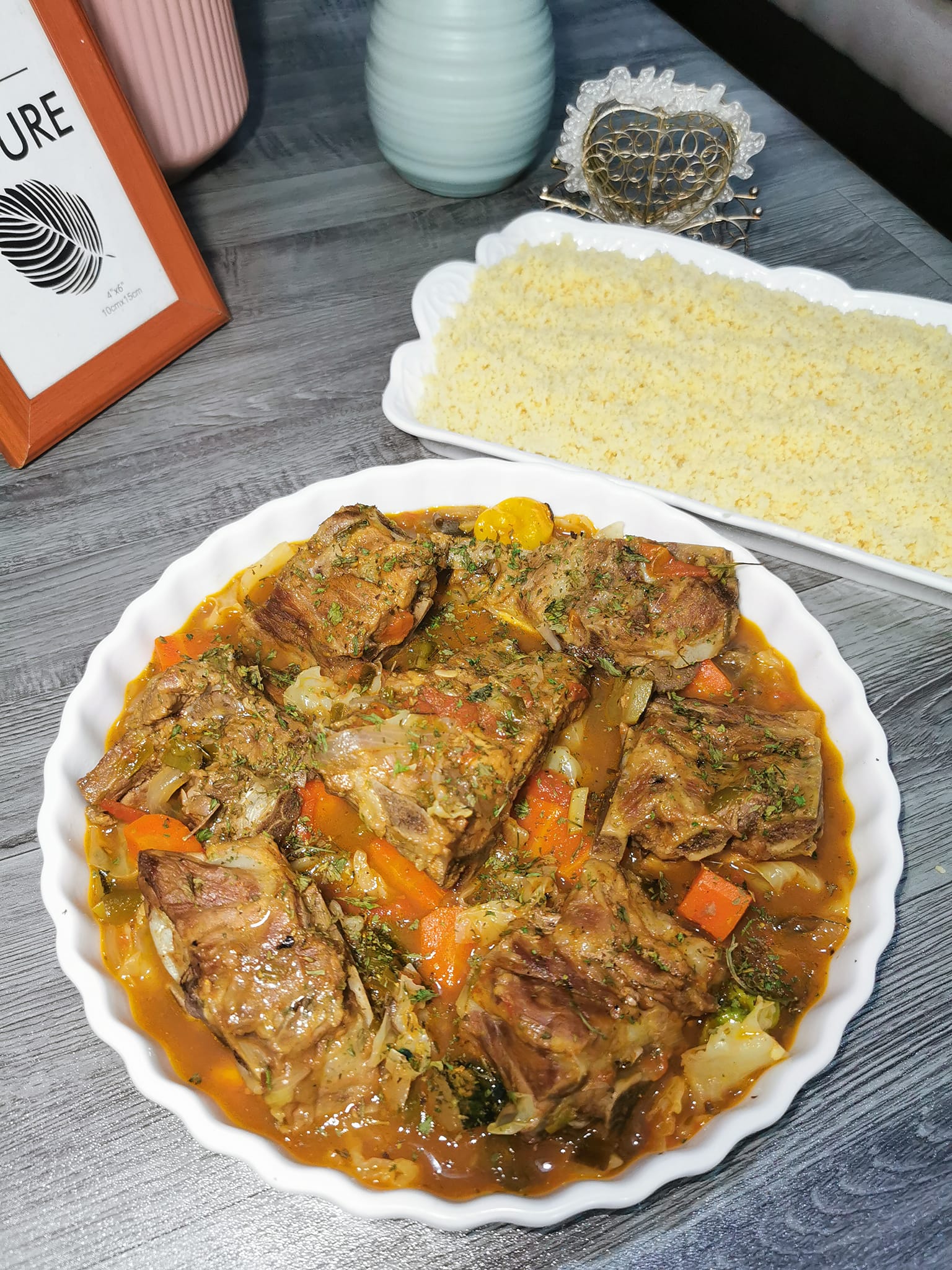 Savourez ce Bouillon de côtelettes de bœuf accompagné de couscous, un plat réconfortant où la tendreté de la viande se marie harmonieusement avec des légumes fondants et une semoule légère.