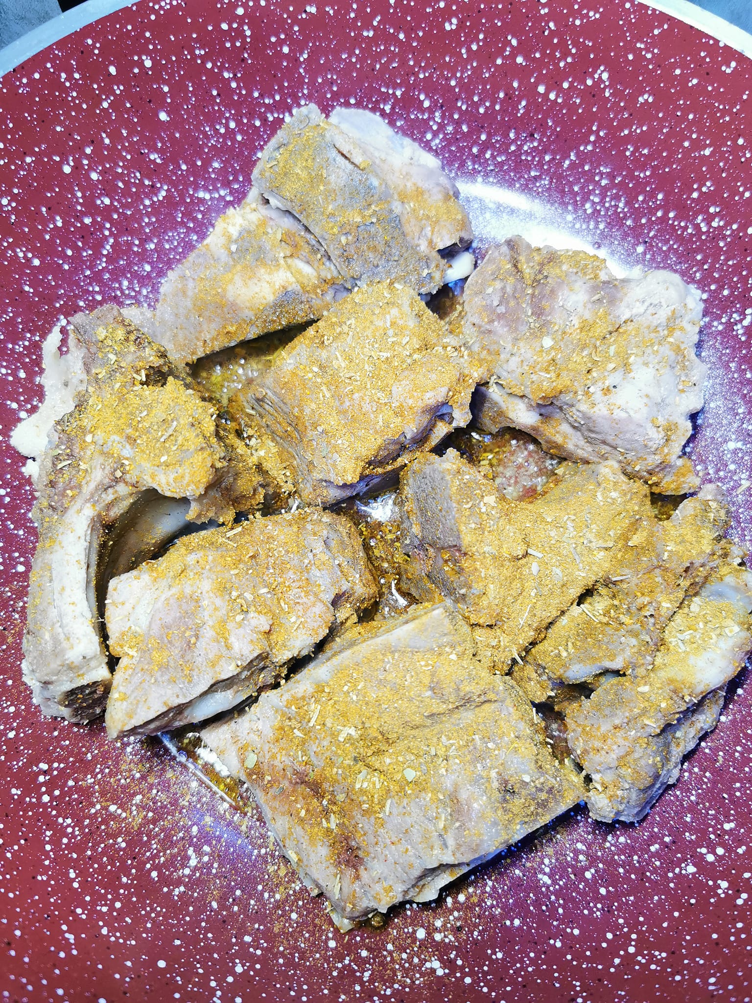 - Dans une casserole légèrement huilée, placez les côtelettes de bœuf. Assaisonnez avec le sel et les épices spéciales pour viande.