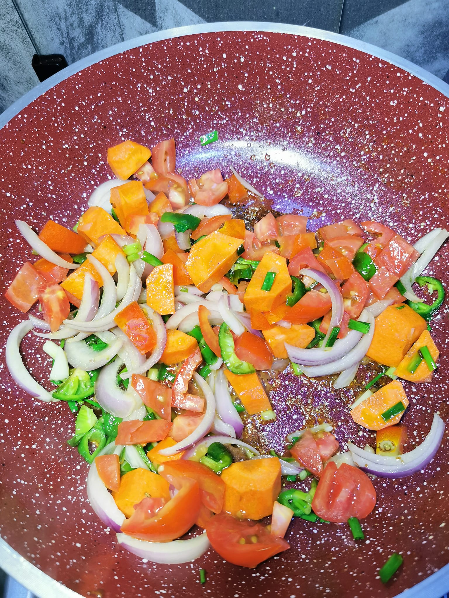 - Retirez la viande de la casserole et réservez. Dans la même casserole, ajoutez les oignons, les poivrons et les carottes. Faites revenir pendant environ 5 minutes.