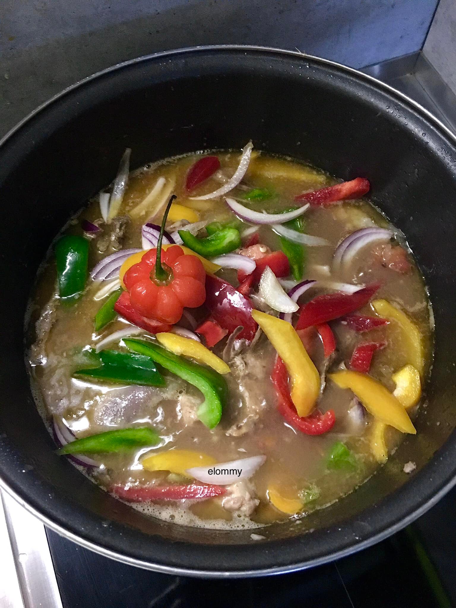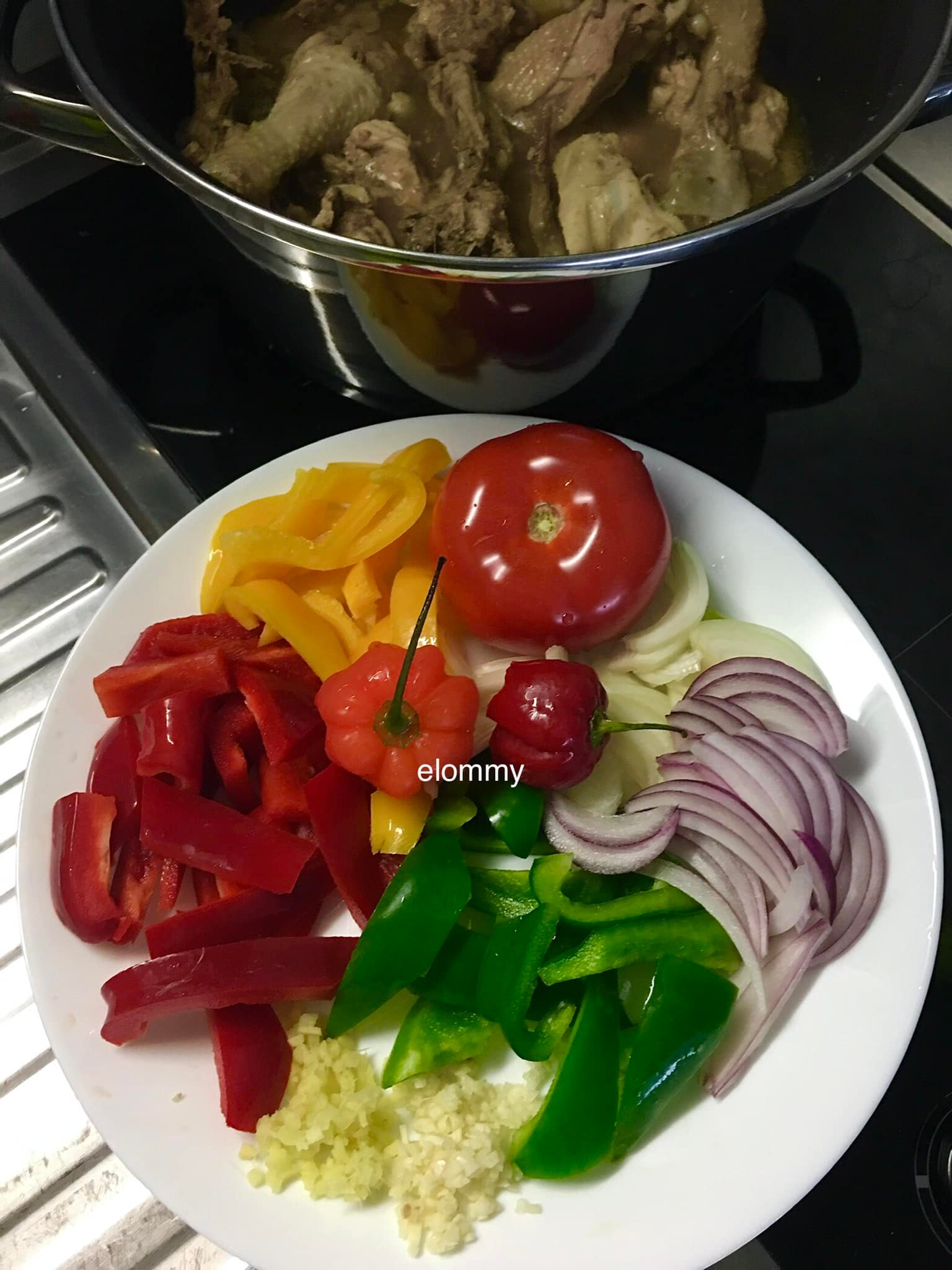- Après ce temps, ajoutez le reste des oignons, les poivrons émincés et le piment frais entier ou haché selon votre tolérance.
