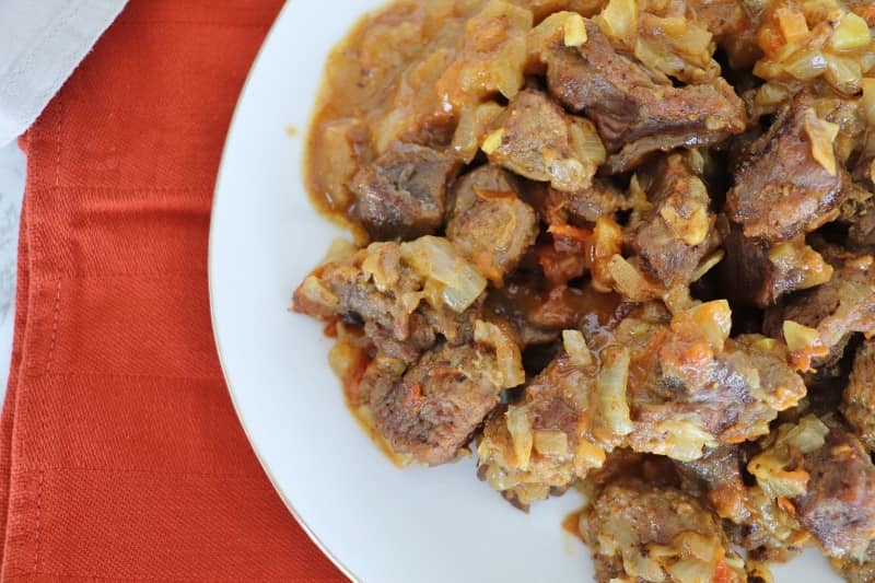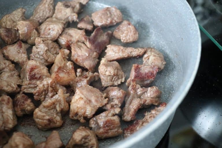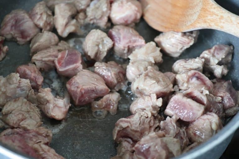 - Remettez la viande dans la poêle, ajoutez de l’eau à hauteur de la viande. Portez à ébullition, puis réduisez le feu et laissez mijoter à feu doux pendant environ 30 minutes, jusqu’à ce que la viande soit bien cuite. Assaisonnez avec du sel et du poivre selon votre goût.