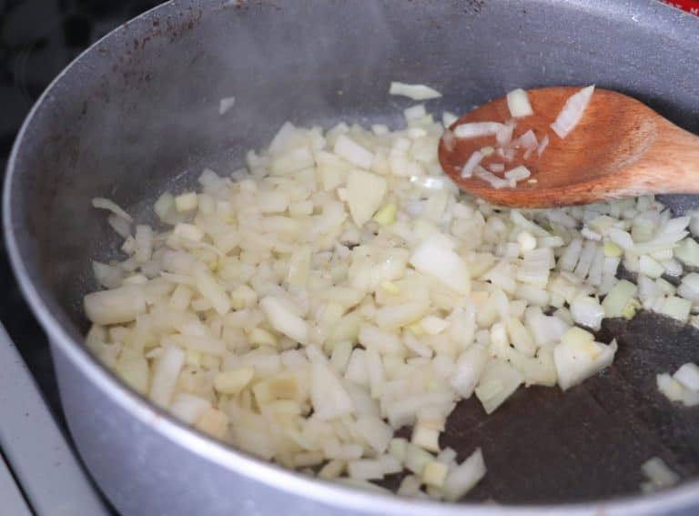 - Dans la même poêle, ajoutez un peu d’huile si nécessaire et faites suer les oignons et l’ail à feu doux jusqu’à ce qu’ils soient translucides.