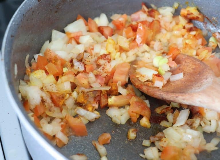 - Incorporez les dés de tomate, le cumin, le safran et le paprika. Mélangez bien et laissez cuire pendant 5 minutes.