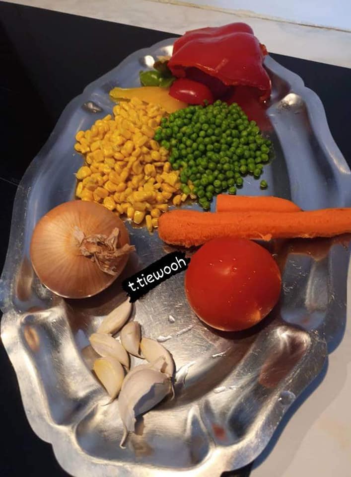 - Ajoutez la carotte, le poivron, le maïs doux, les petits pois et la tomate. Mélangez bien et laissez cuire pendant 10 minutes, ou jusqu’à ce que les légumes soient tendres.
