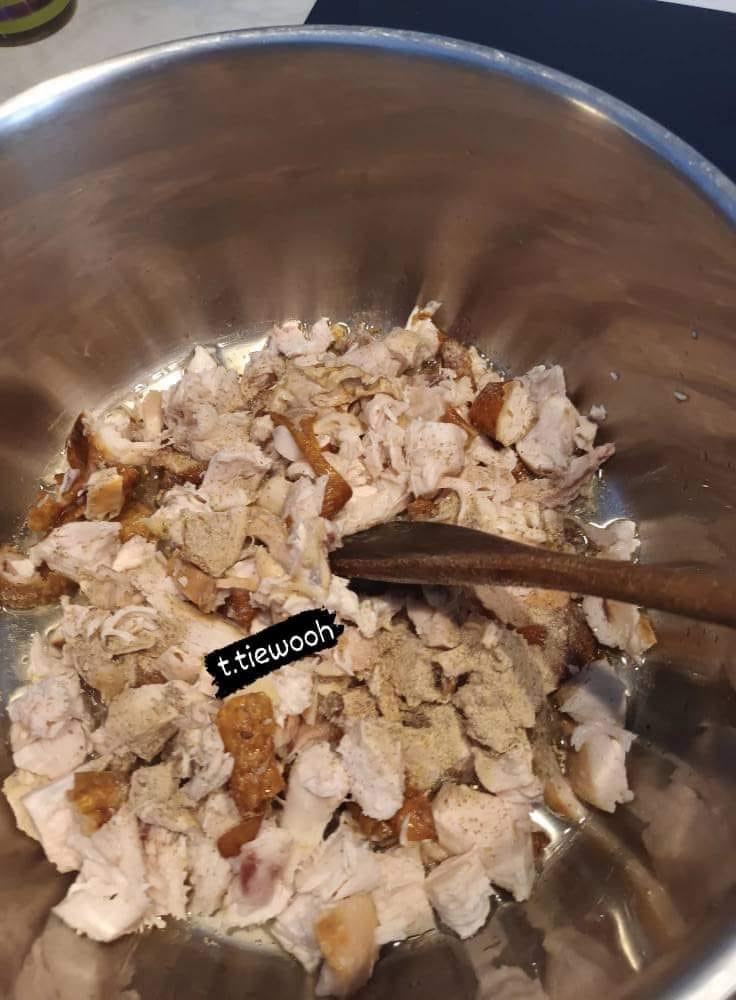 - Dans une poêle, chauffez l’huile à feu moyen. Ajoutez les dés de poulet fumé, salez et poivrez. Faites revenir pendant environ 5 minutes jusqu’à ce qu’ils soient légèrement dorés.