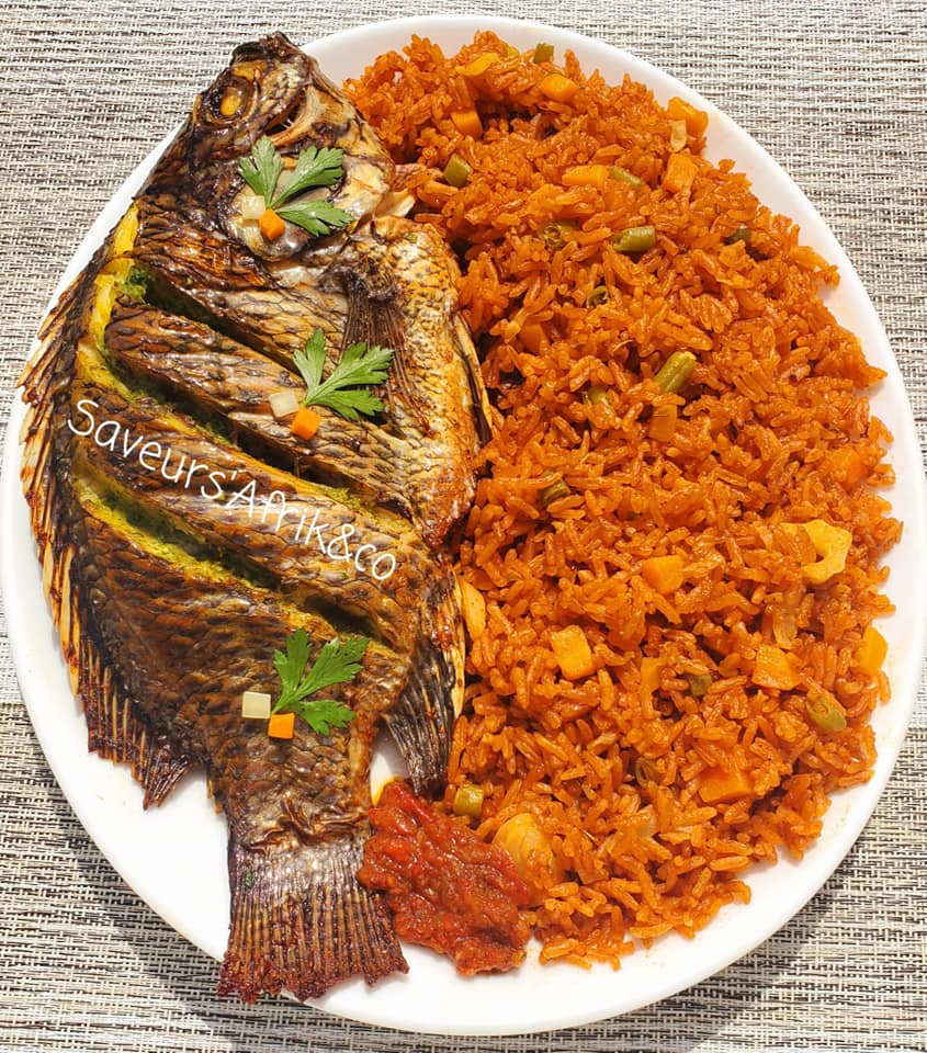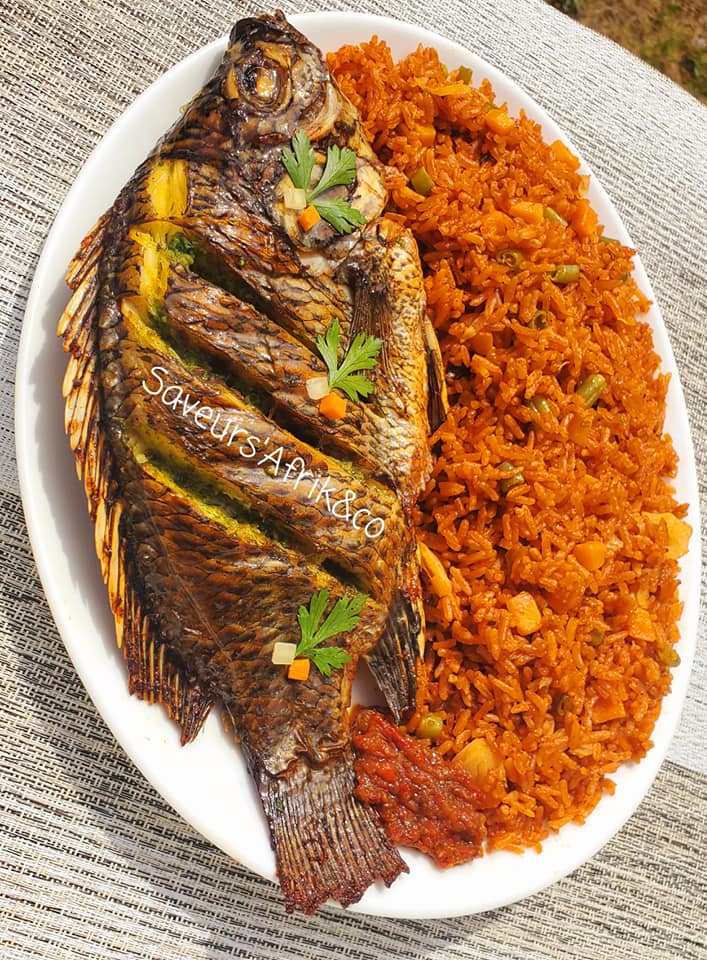 Découvrez ce Jollof Rice aux légumes accompagné de poisson braisé au four, un plat emblématique de l’Afrique de l’Ouest qui marie la richesse d’un riz épicé à la douceur d’un poisson délicieusement braisé.