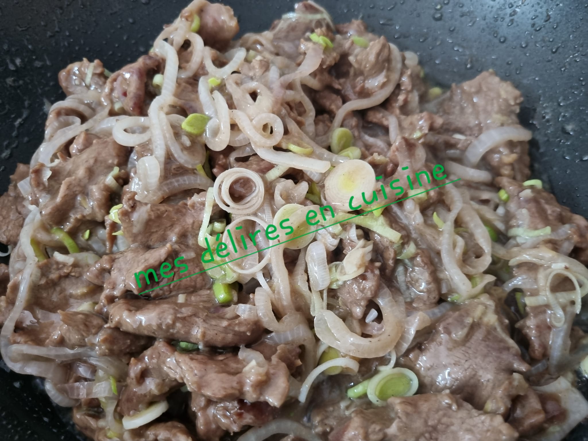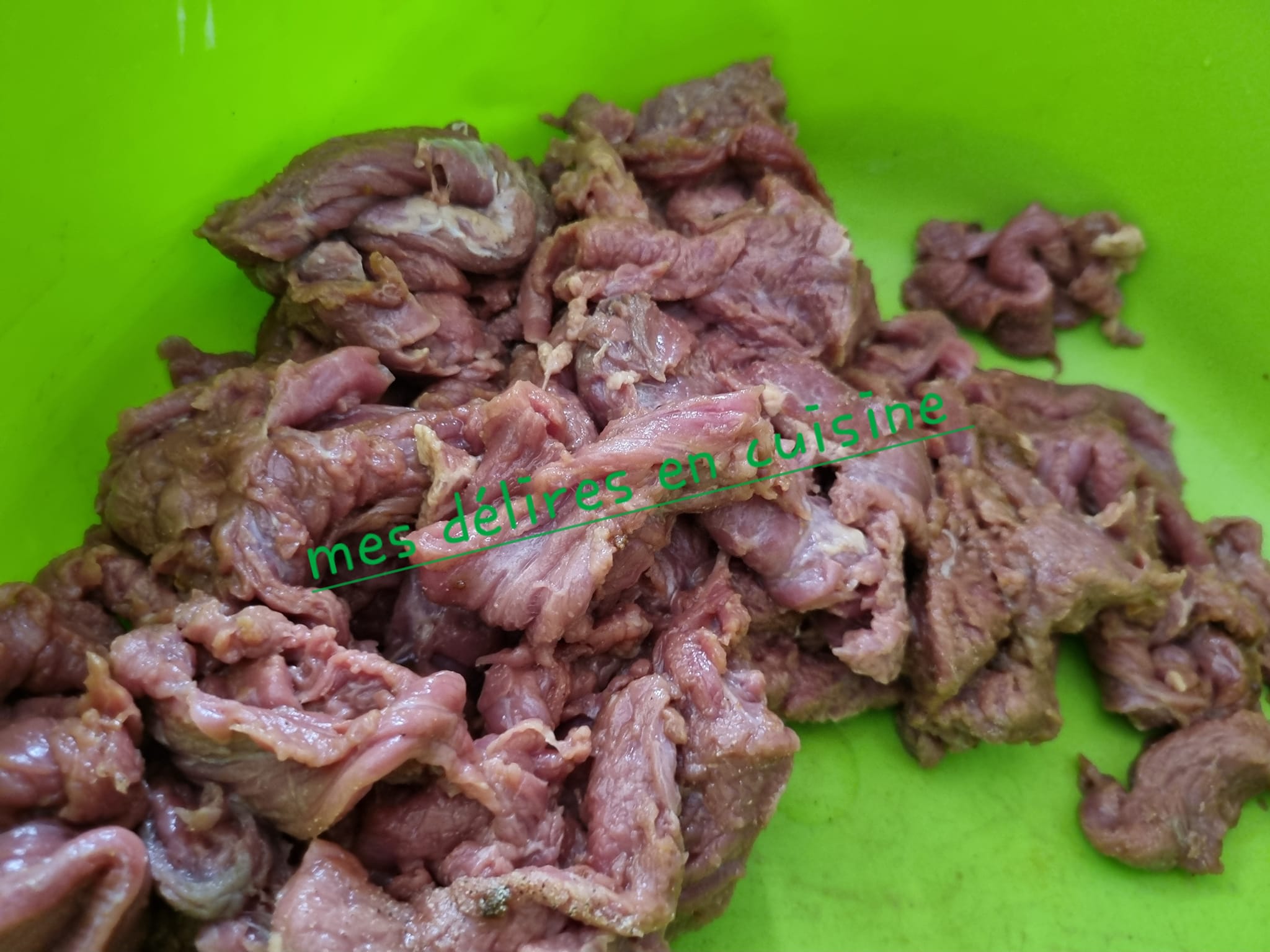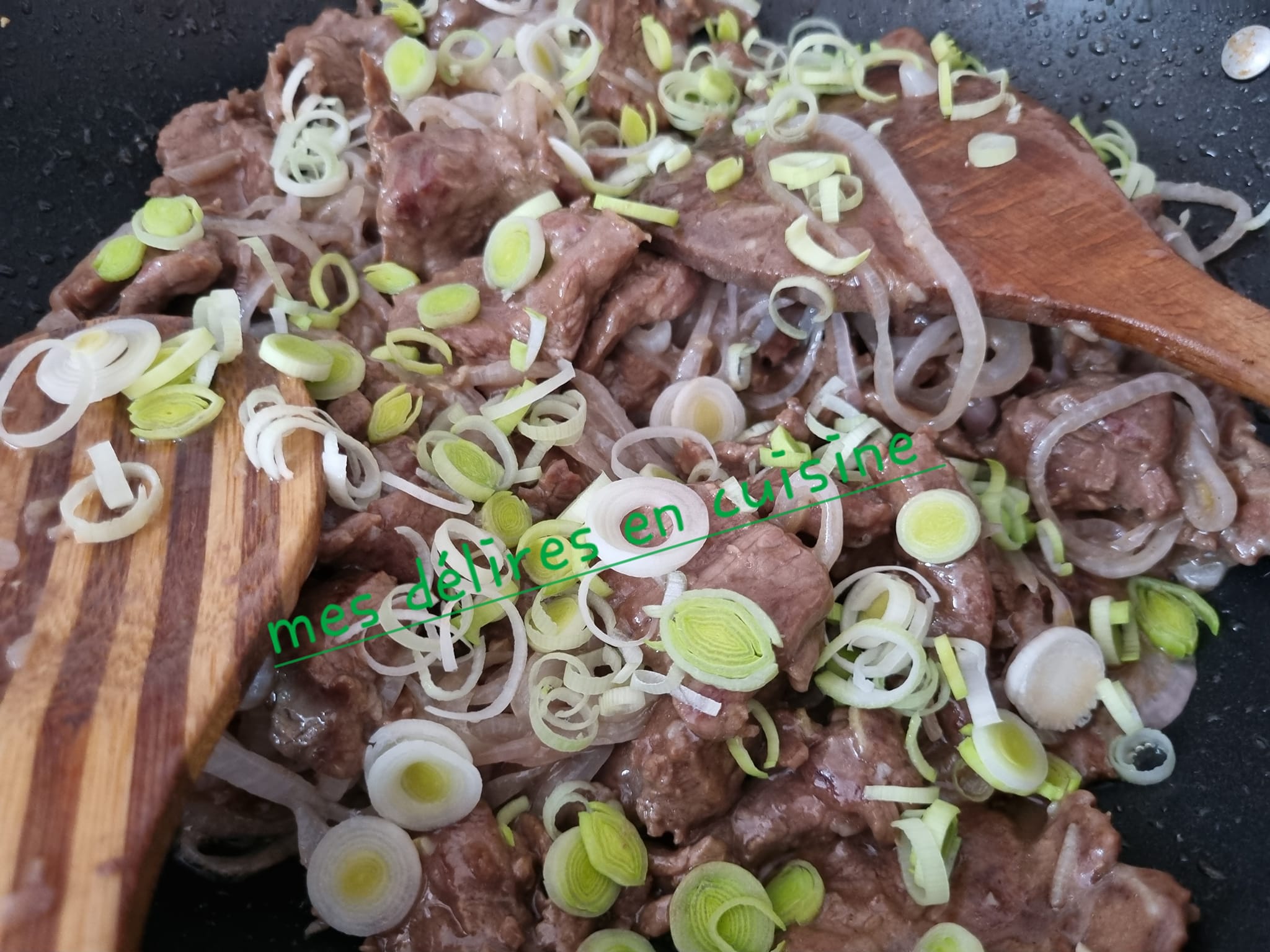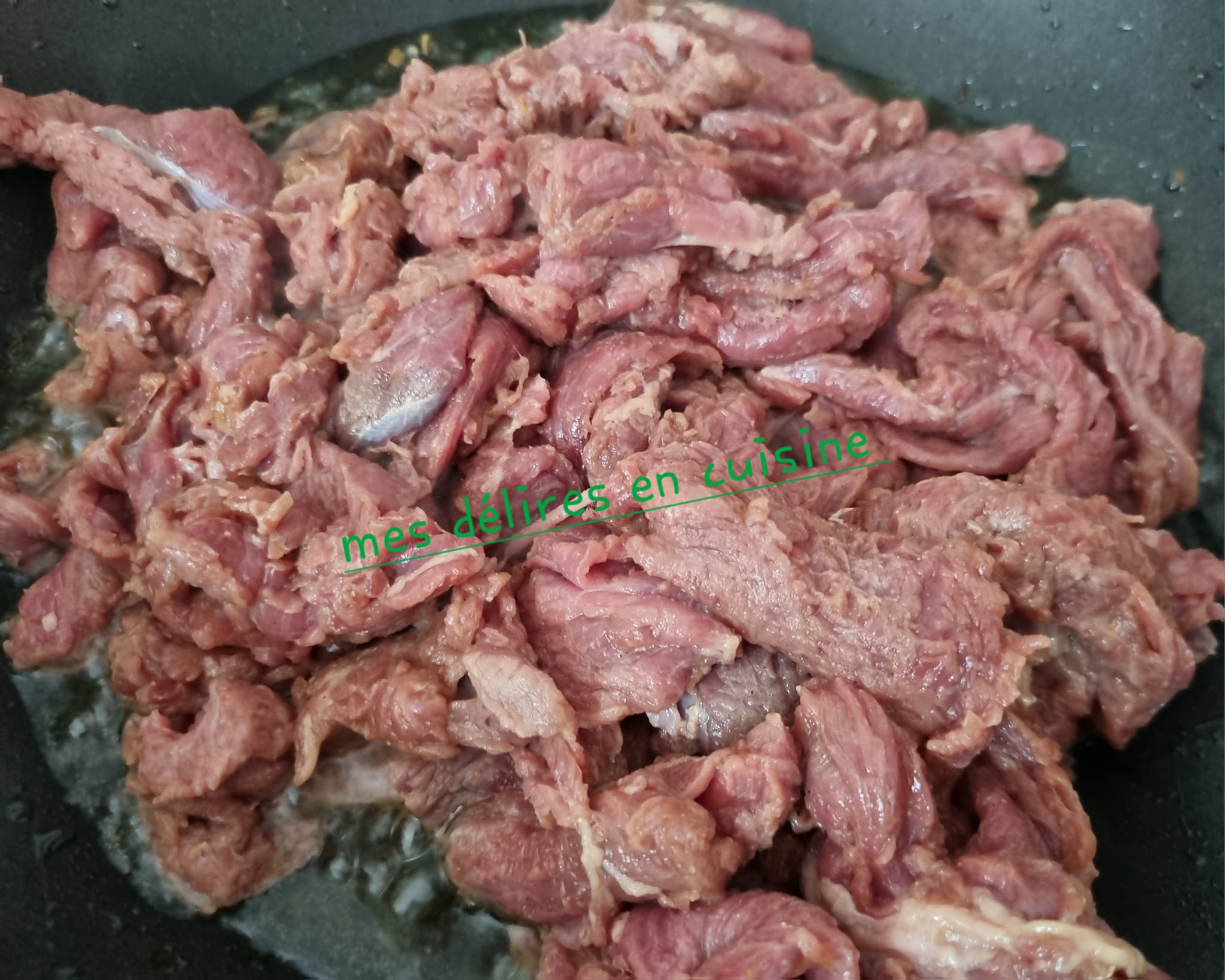 - Incorporez la viande marinée et faites-la saisir rapidement pour qu’elle soit bien dorée.