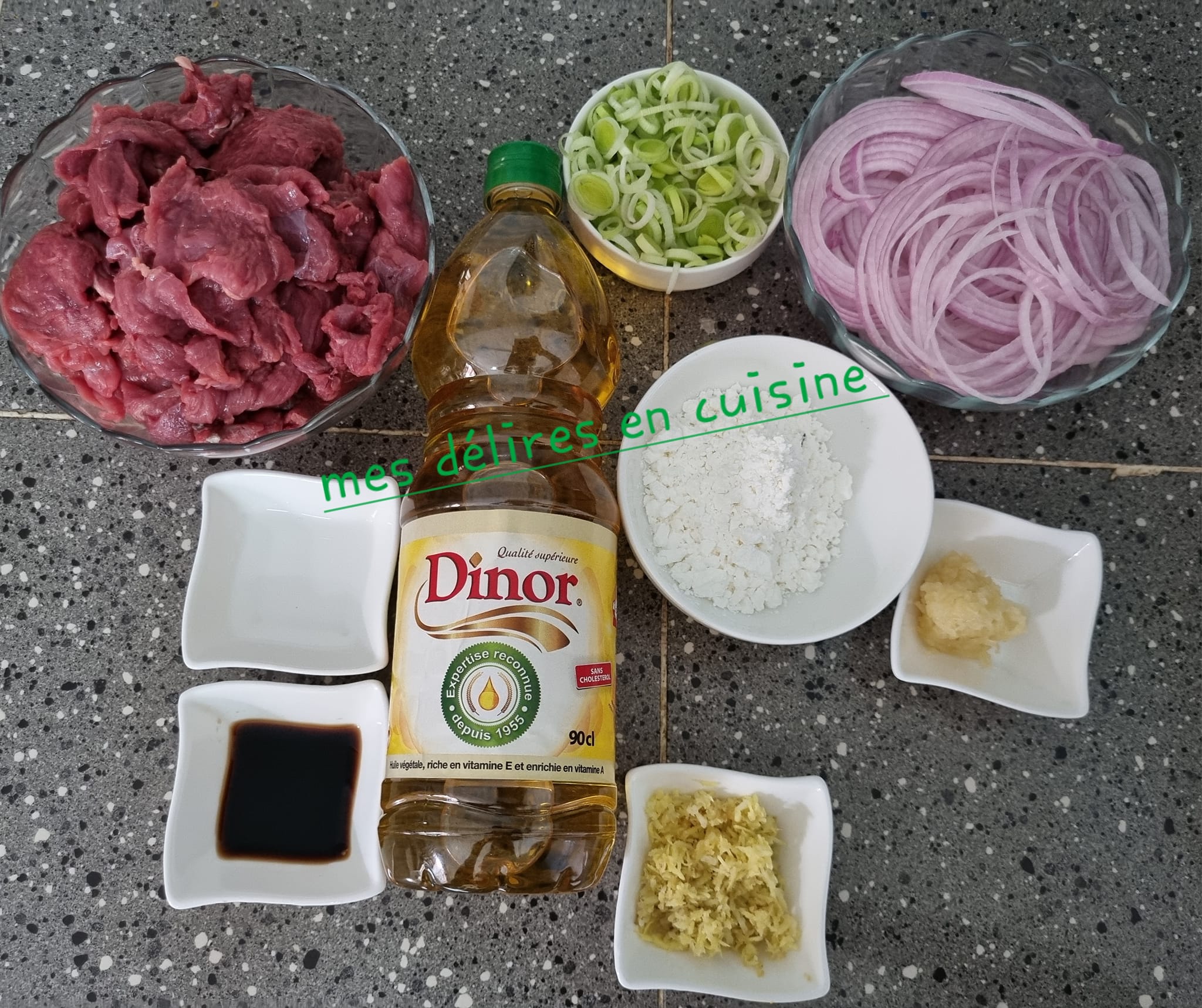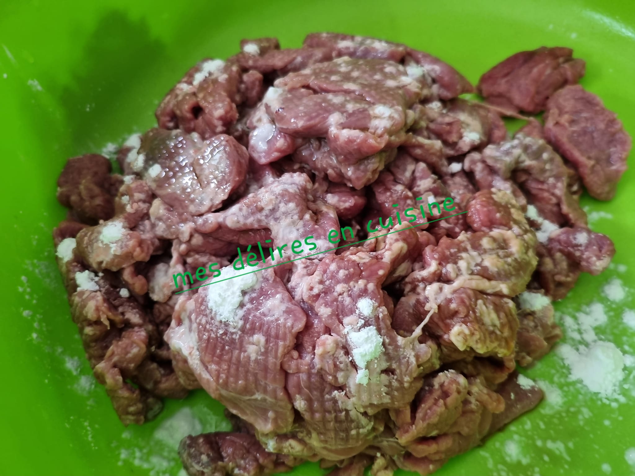 - Dans un grand bol, mélangez la viande de bœuf avec la maïzena, la sauce soja et le vinaigre de riz.