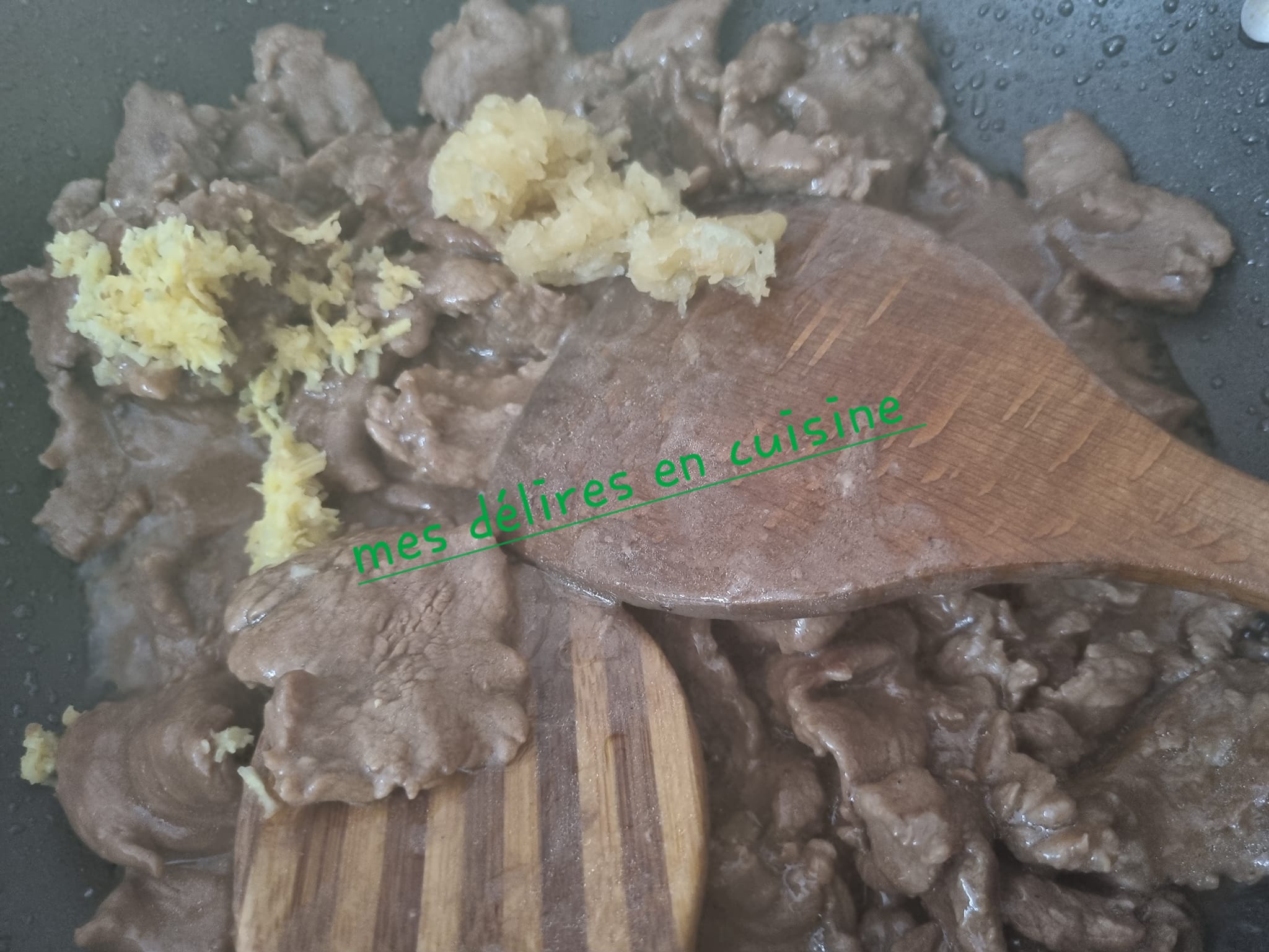 - Réduisez le feu à moyen et ajoutez l’ail et le gingembre râpés à la viande.