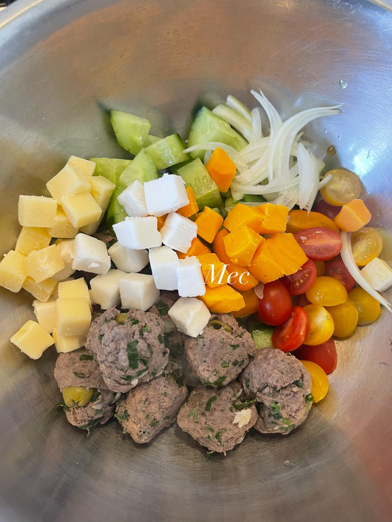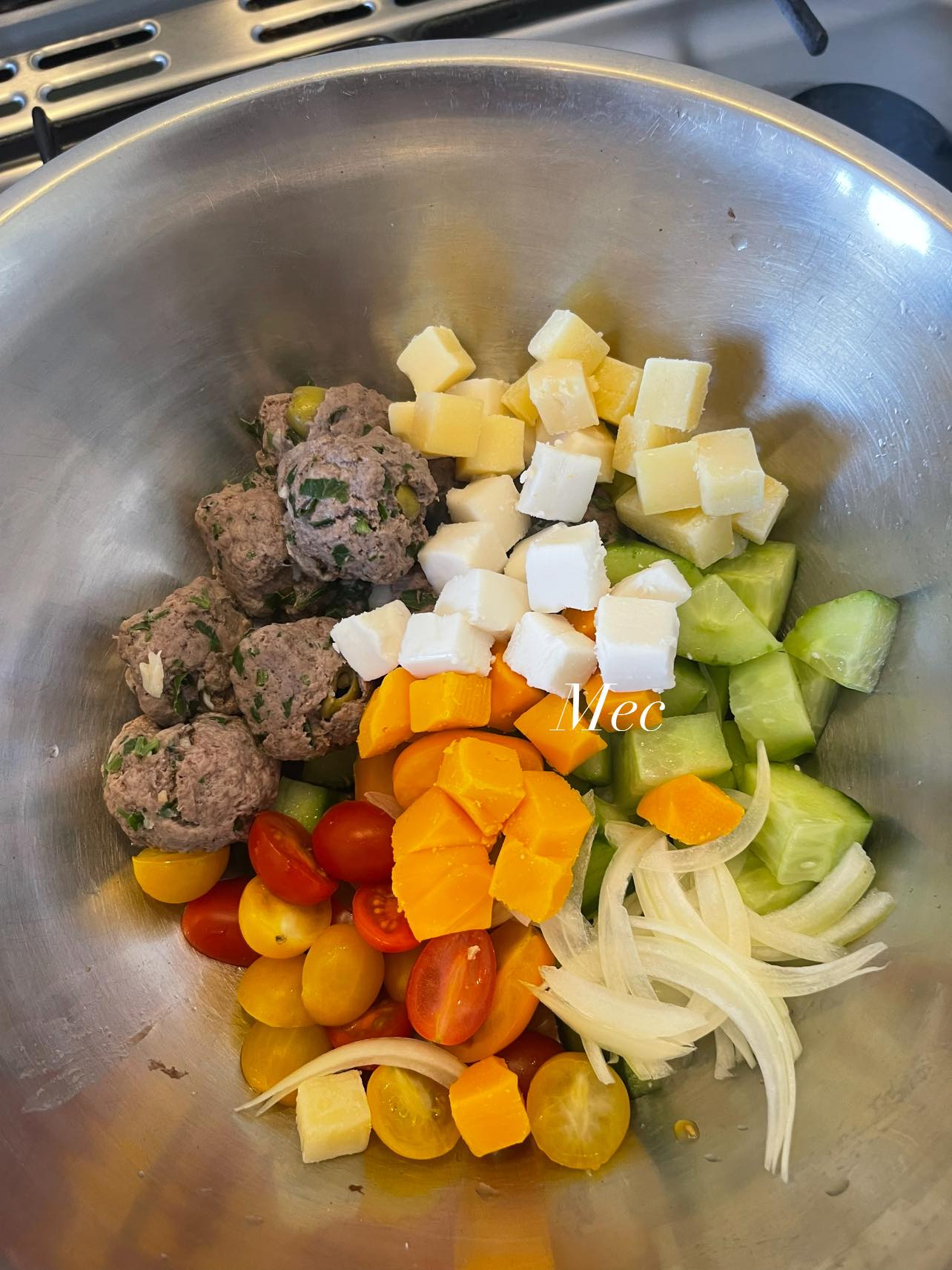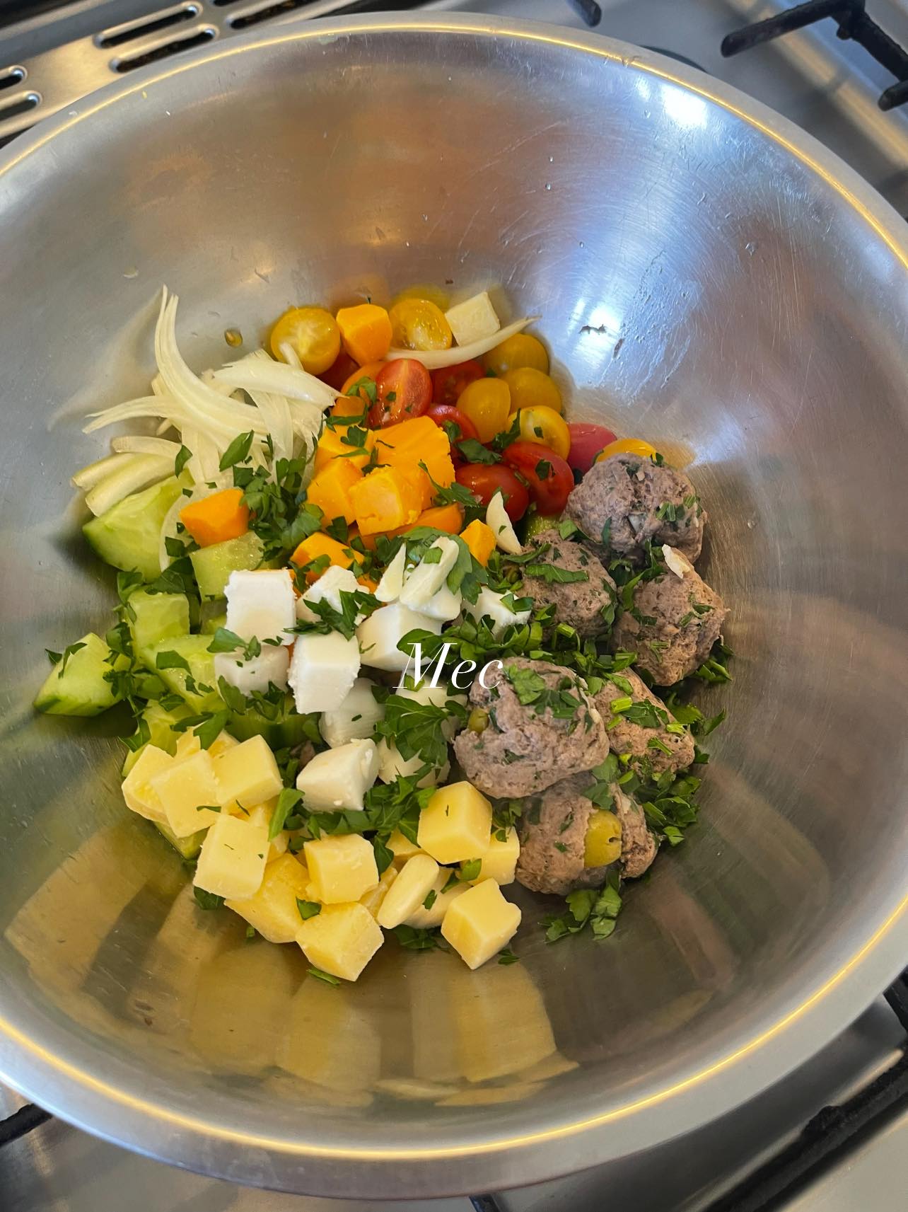 - Coupez la tomate en dés, émincez l’oignon, et ajoutez les carottes précuites.