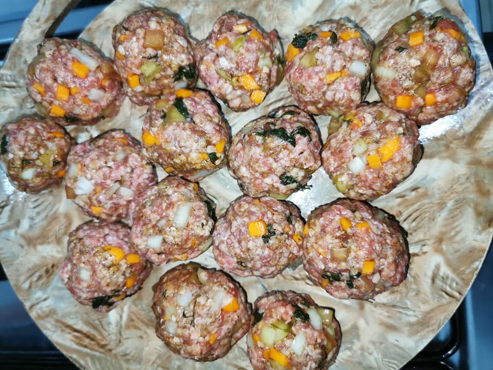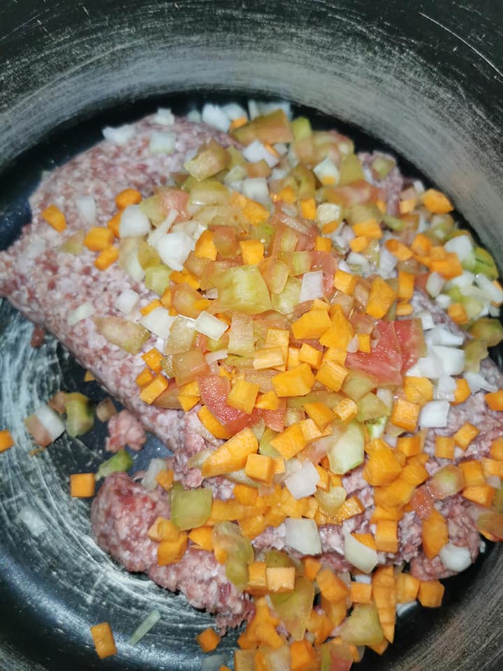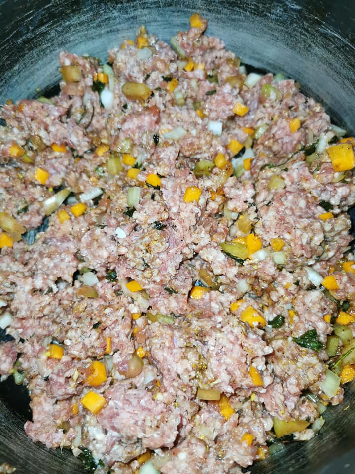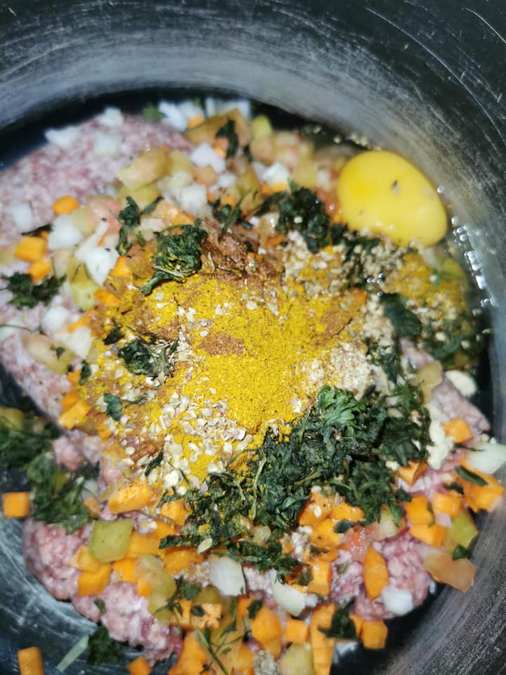 - Dans un saladier, mélangez la viande hachée avec un œuf, les carottes en dés, un peu d’ail, de curry, d’origan, de sel et de poivre.