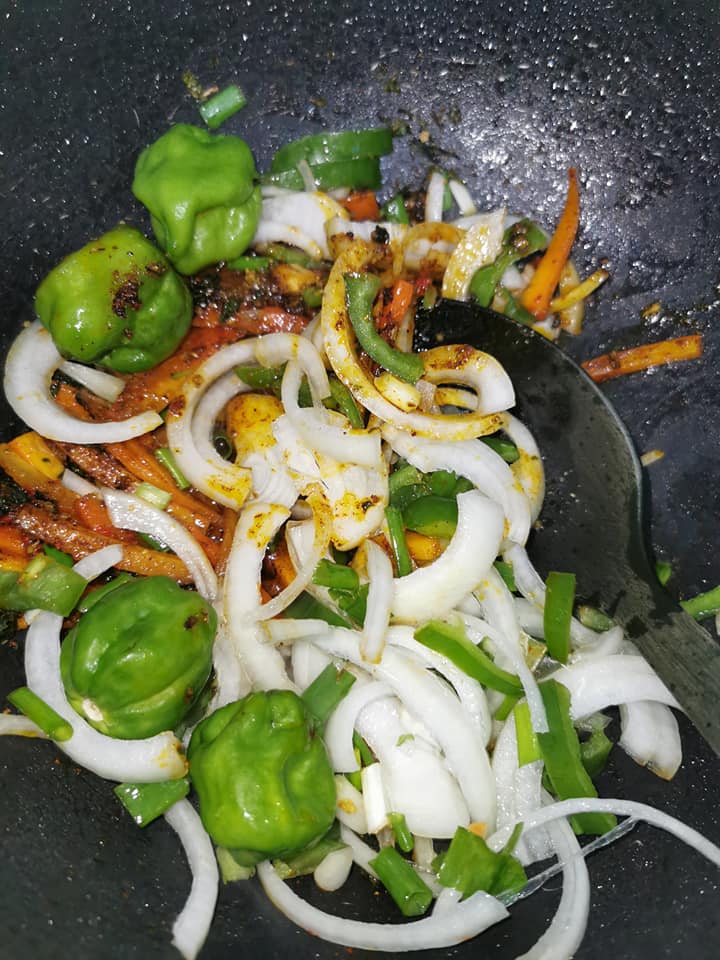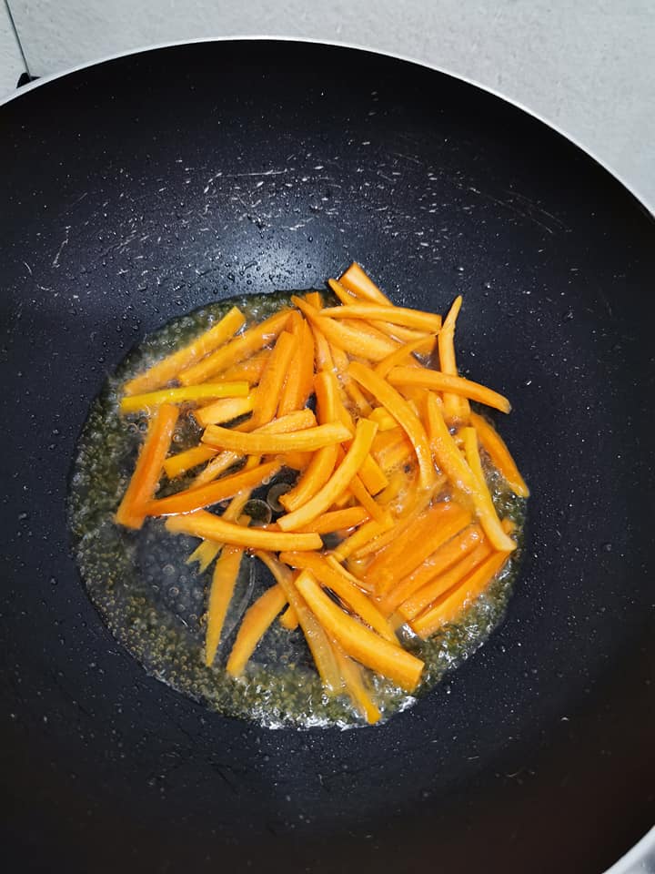 - Dans une casserole avec un peu d’huile, faites revenir les carottes restantes, les oignons, les poivrons et les tomates.