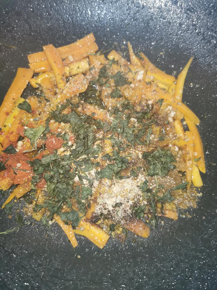 - Ajoutez les épices (curry, origan, ail, oignons séchés). Laissez mijoter 10 minutes.